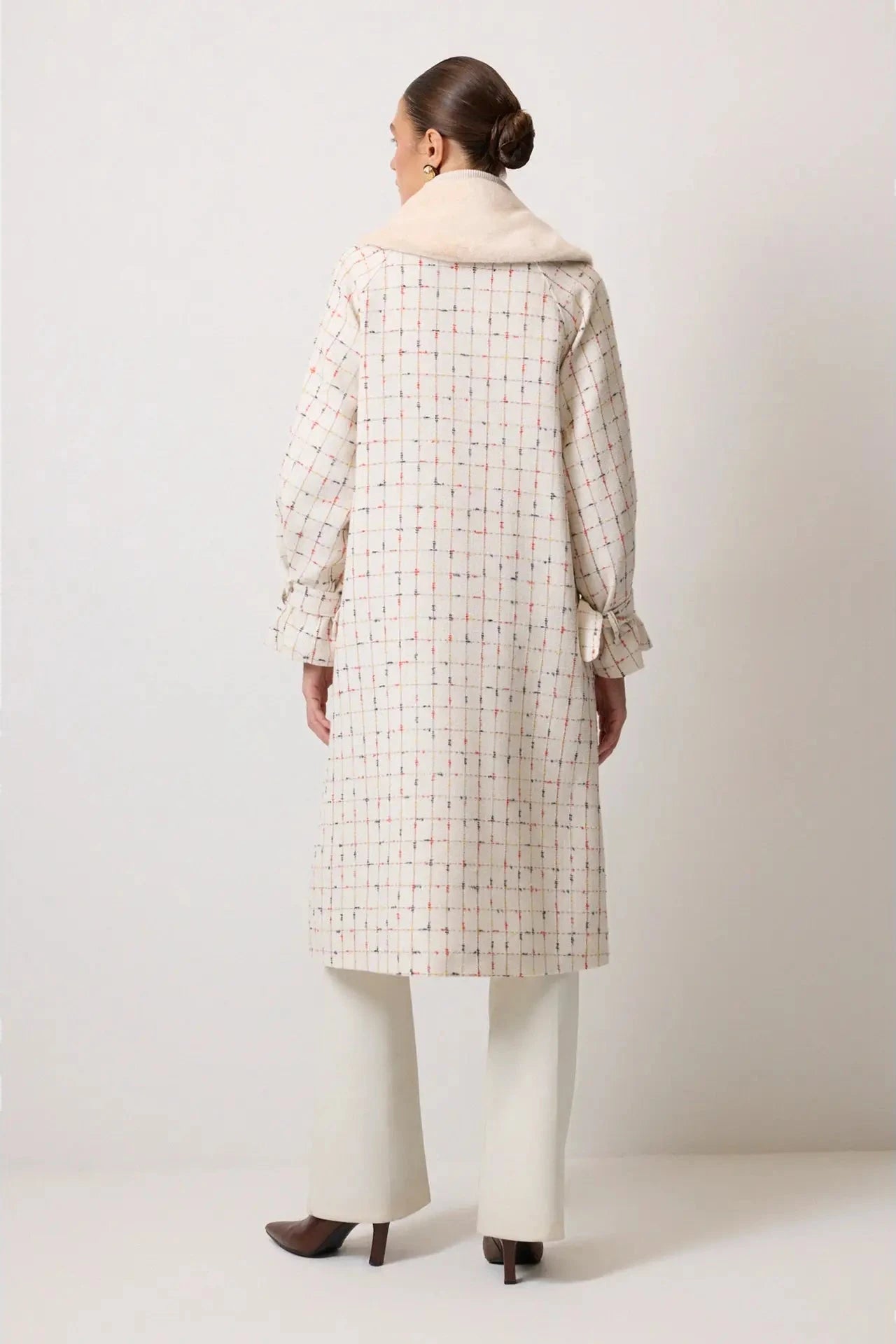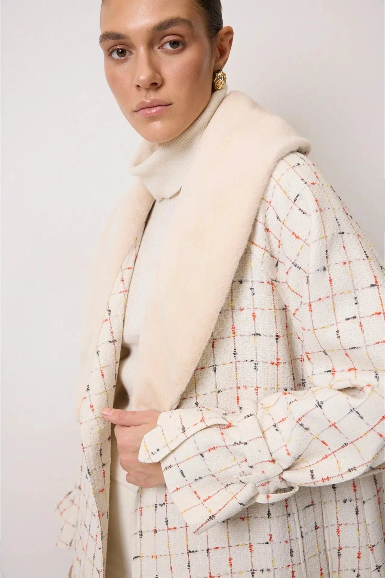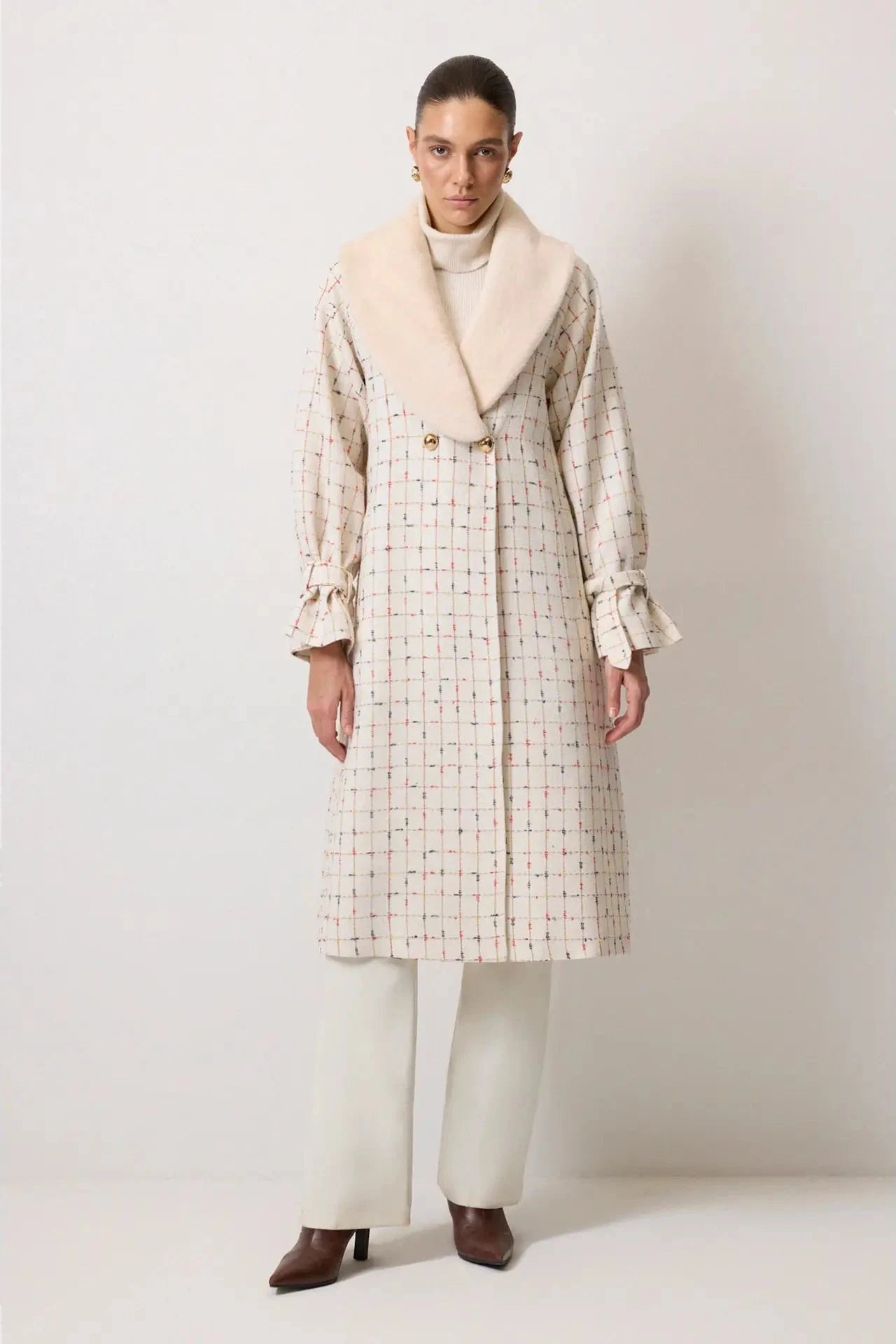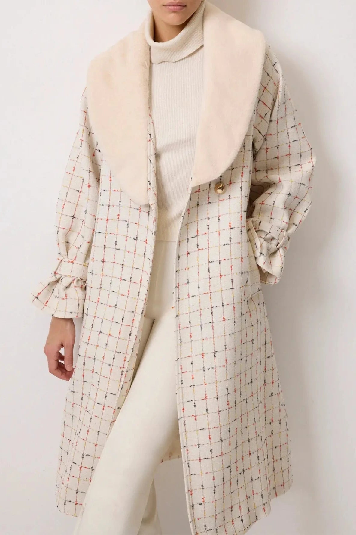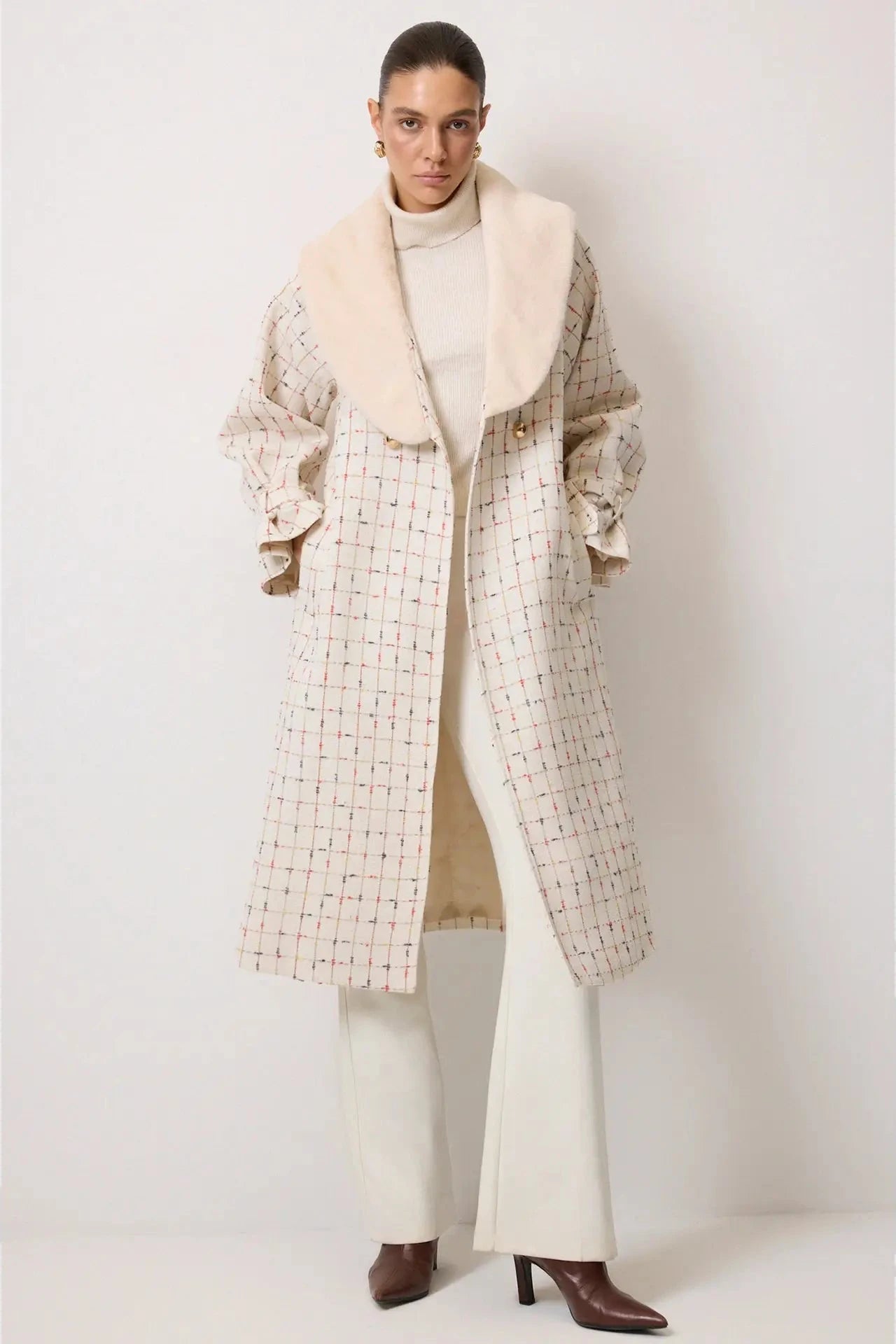 Abrigo largo de tweed a cuadros con cuello de chal de piel sintética y puños fruncidos. Silueta estructurada, elegante y cálida, ideal para el invierno.