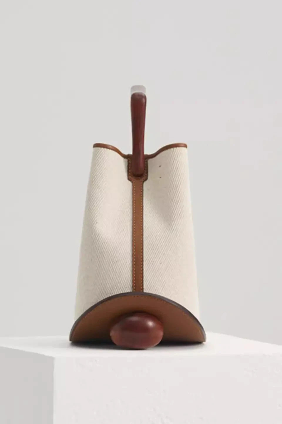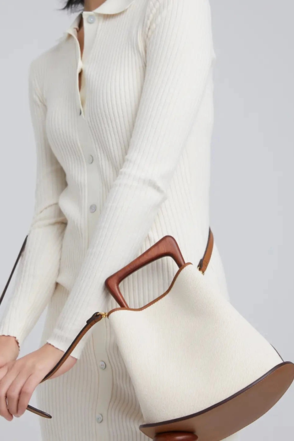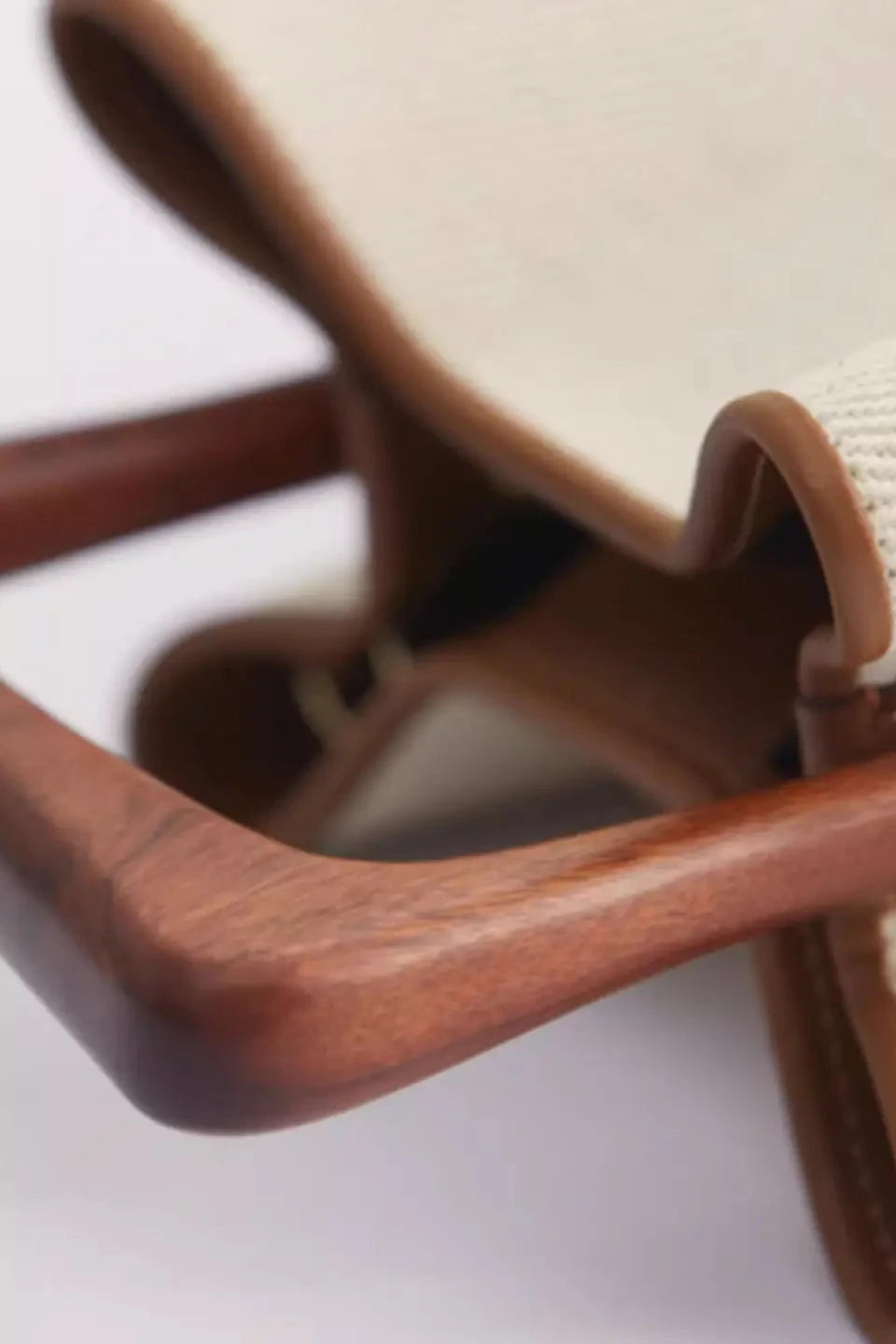 Bolso de hombro Ozzy elaborado en cuero de lujo y madera fina. Con base curva inspirada en la silueta femenina y correa ajustable, es una pieza de elegancia atemporal.