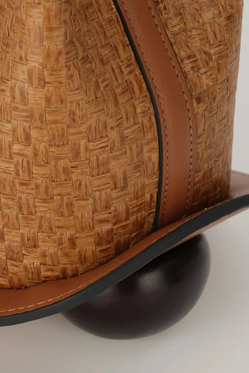 Ozzy Bag en rafia y cuero. Una pieza única que combina materiales orgánicos con acabados de lujo, logrando una elegancia atemporal y llena de carácter.