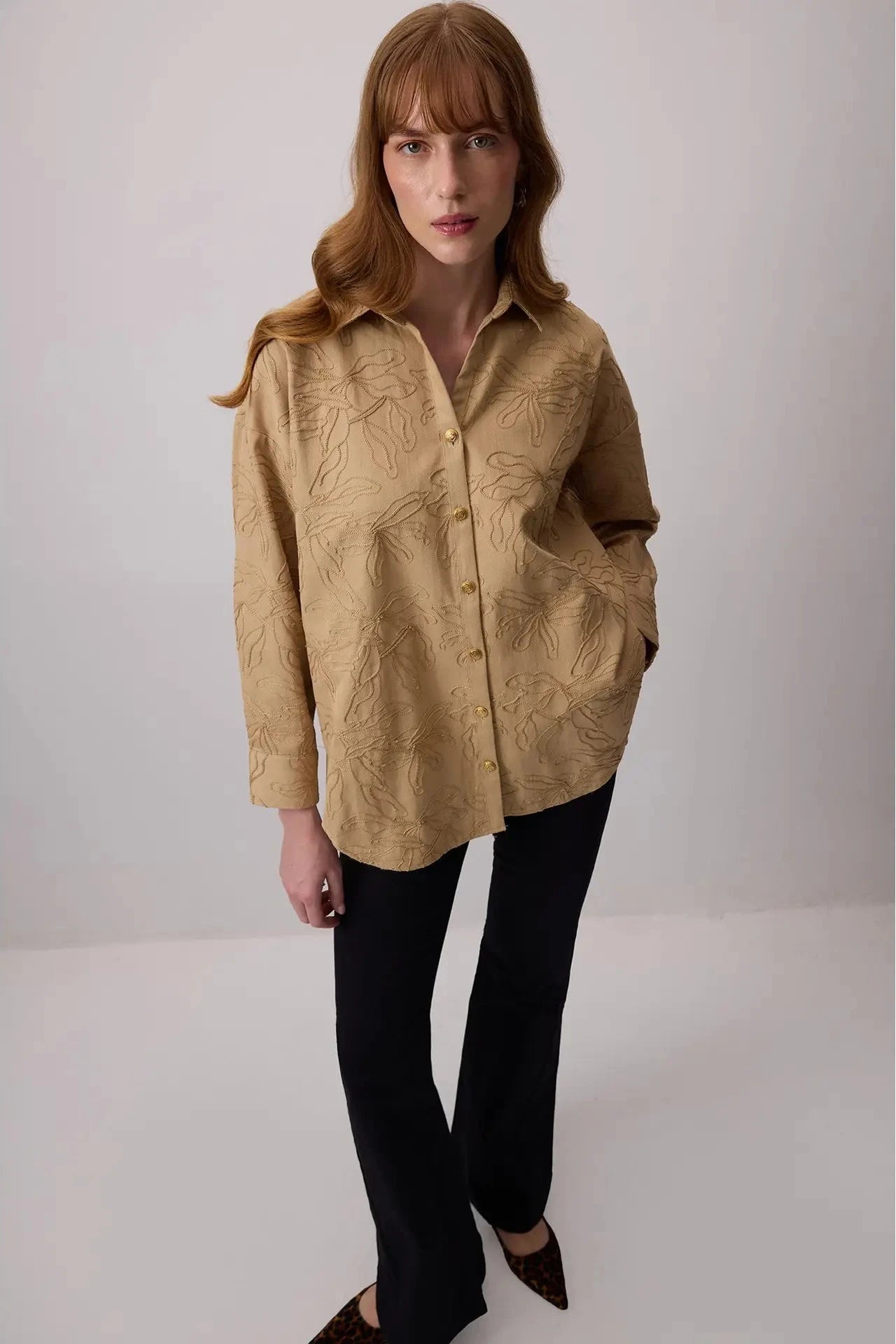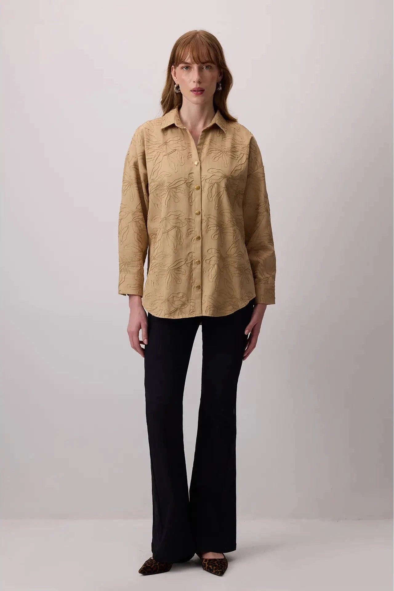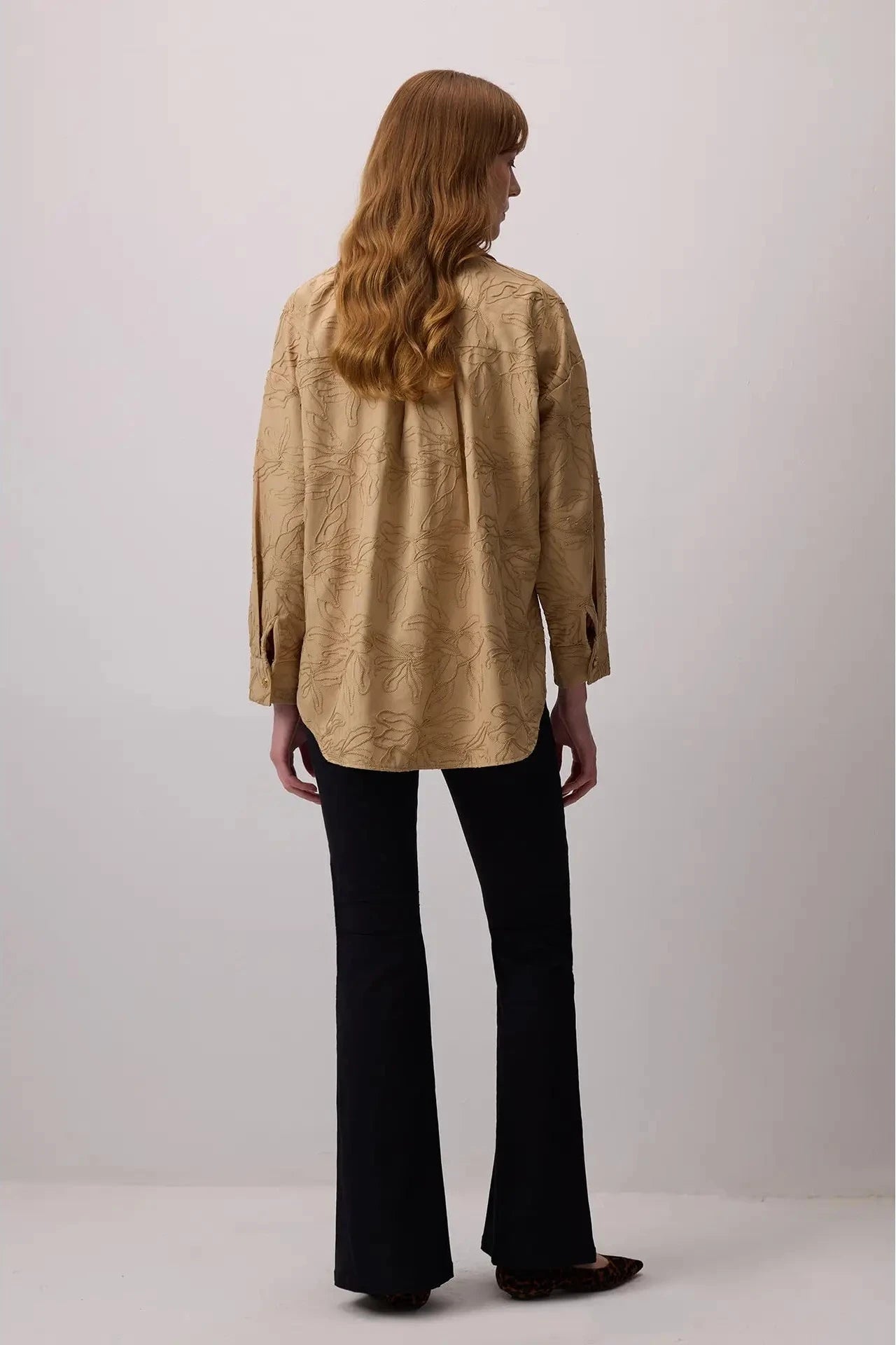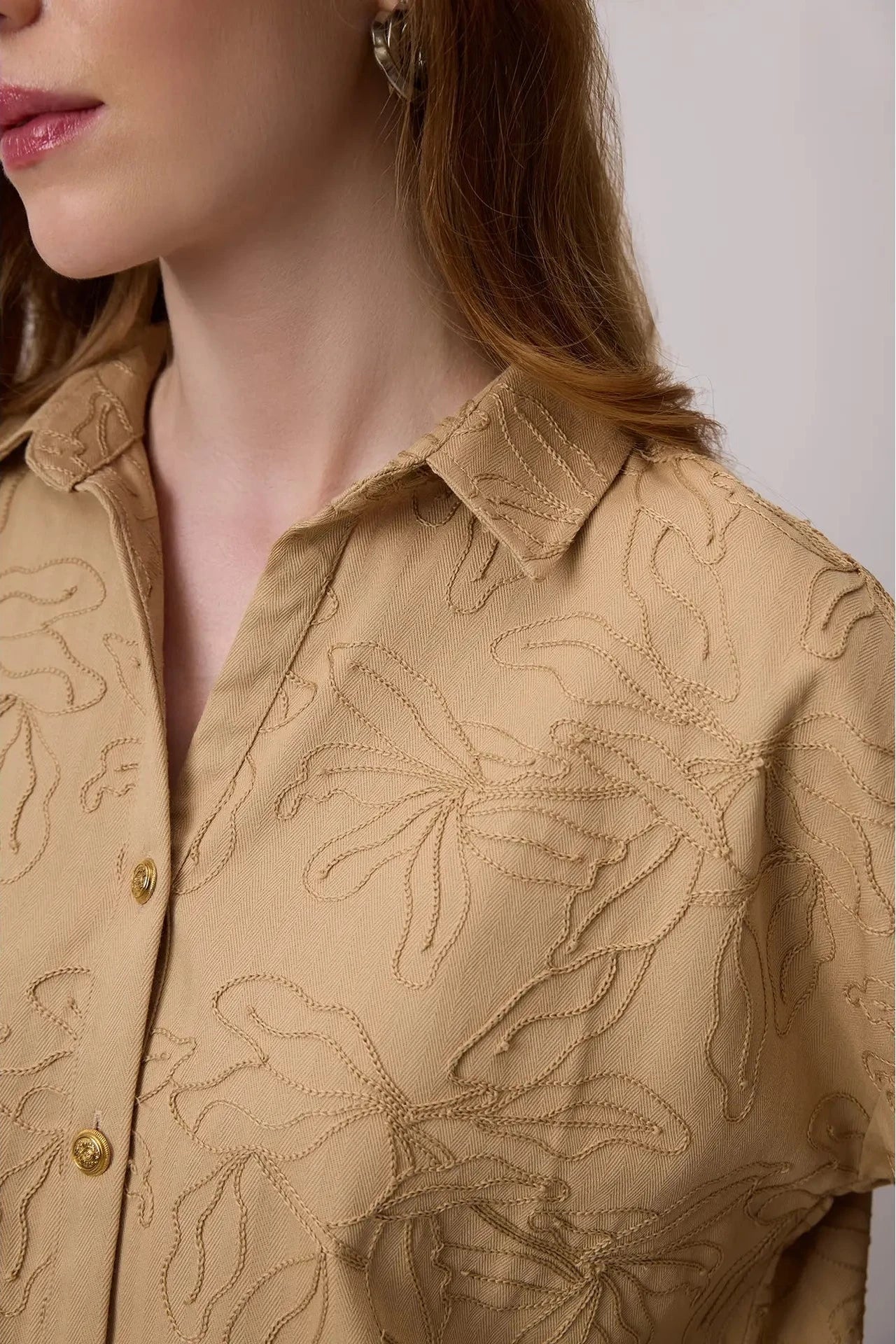 Camisa de algodón con bordado a tono que aporta textura y sutileza. Su silueta limpia y el detalle artesanal la convierten en una prenda versátil y atemporal, ideal para looks minimalistas con un toque distintivo.