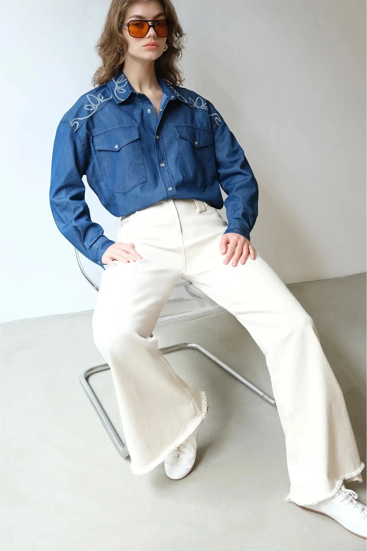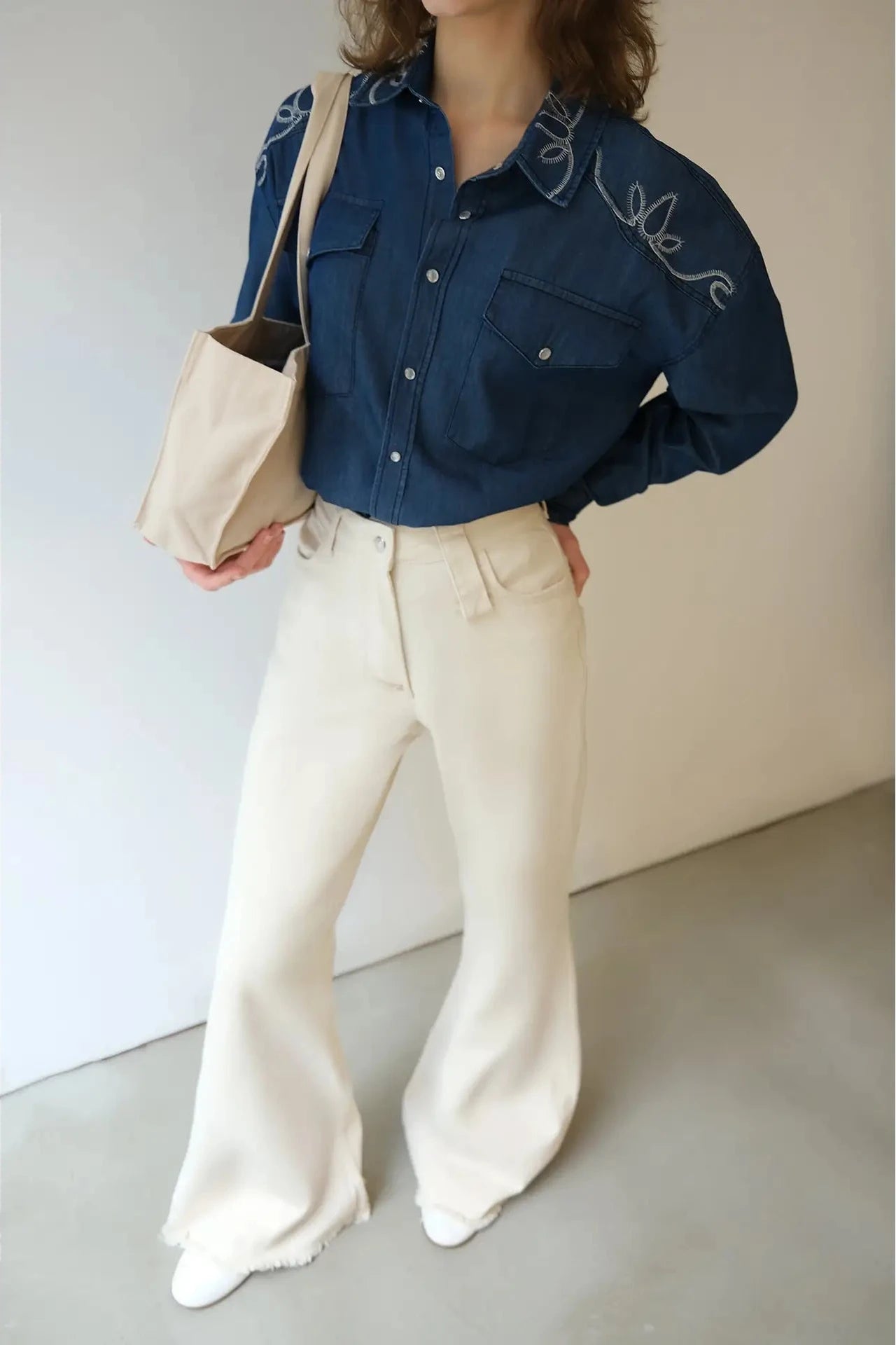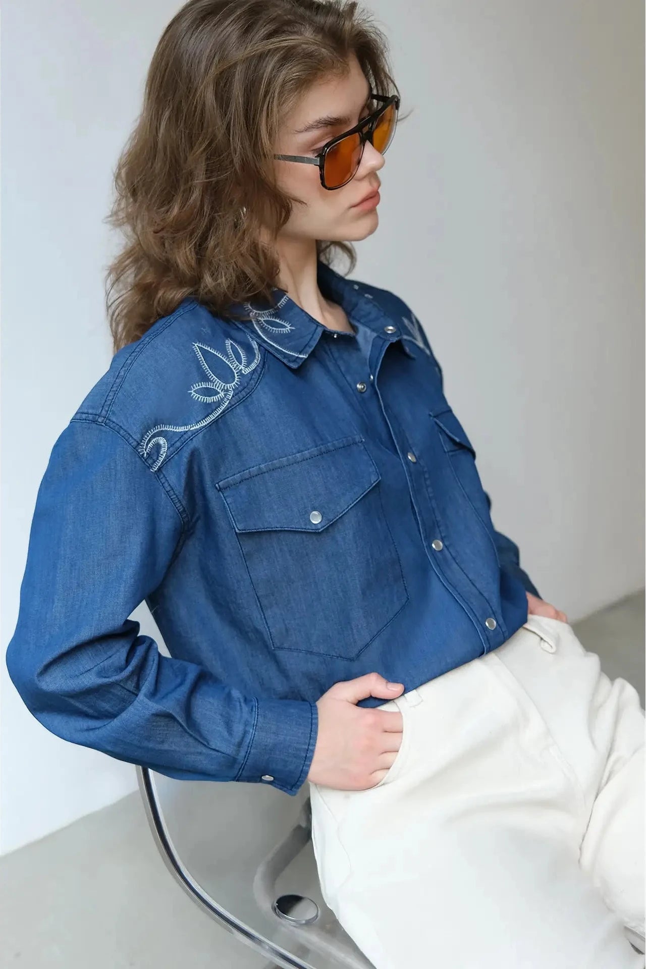 Camisa de algodón efecto denim con bordados en hombros y cuello. Detalles western y corte versátil que permite llevarla suelta o fajada. Una pieza atemporal con carácter casual y refinado.
