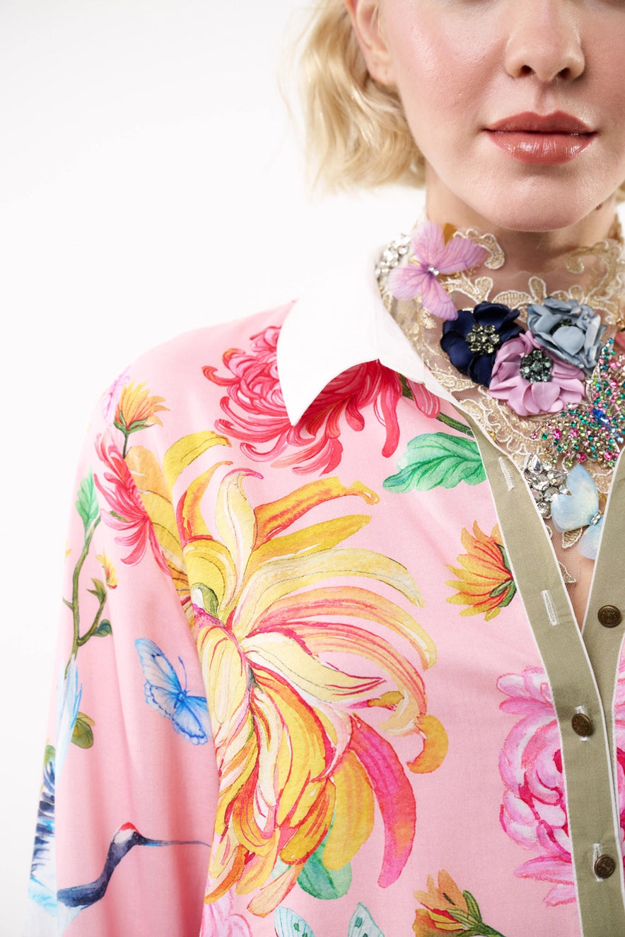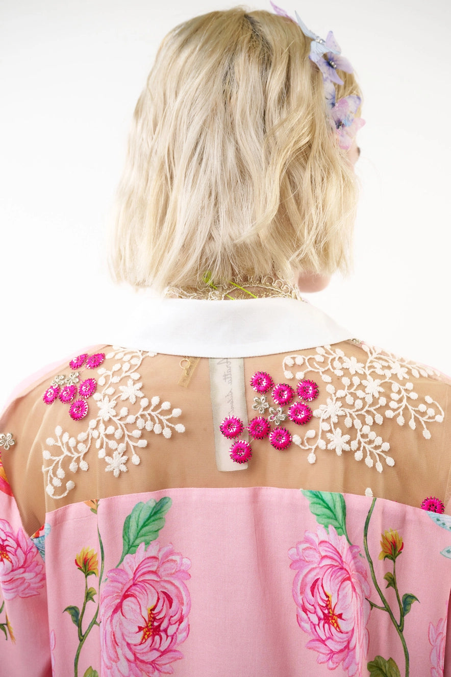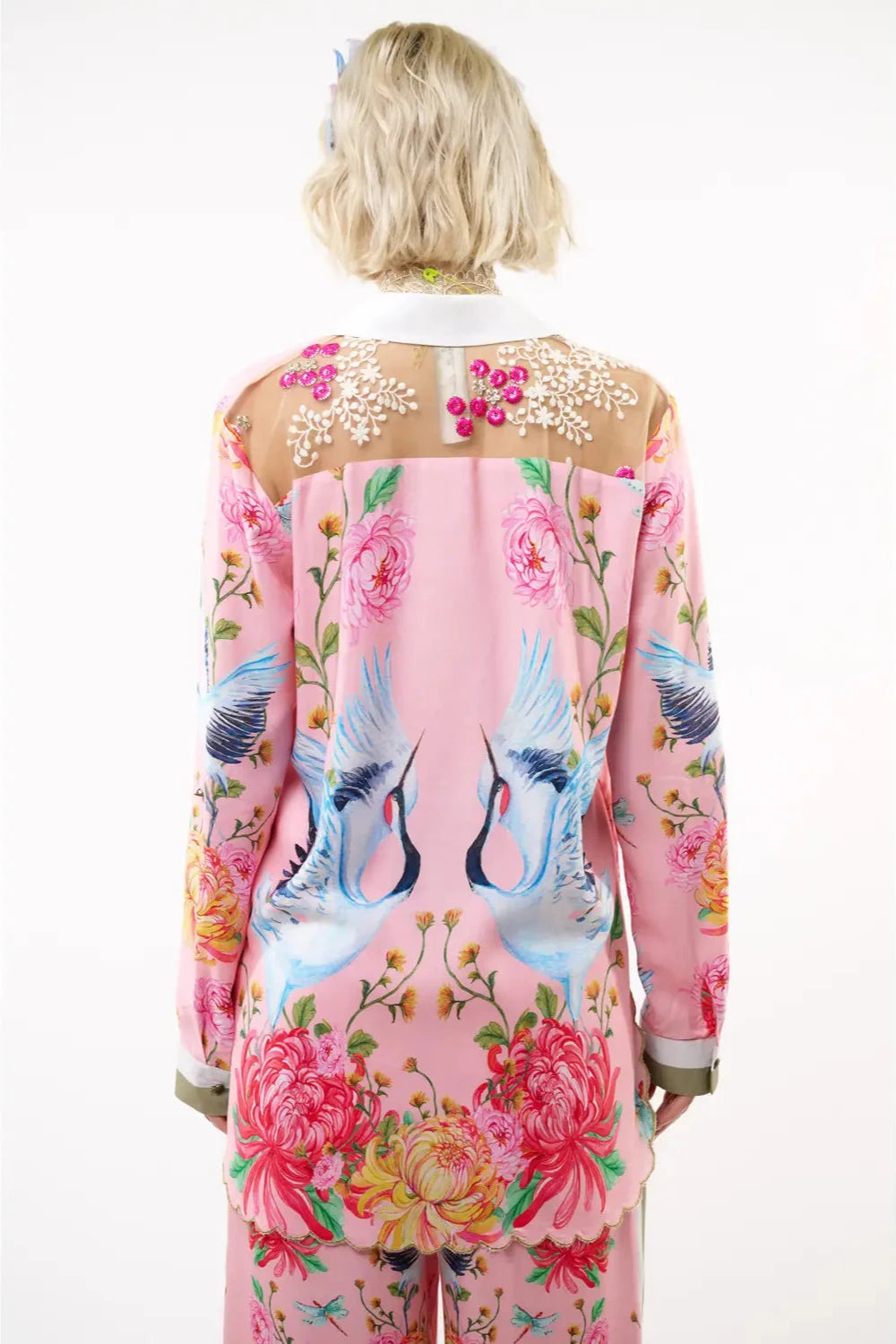 Camisa con estampado floral y de grulla, con canesú trasero de malla bordada. Una combinación de ligereza, textura y detalle.