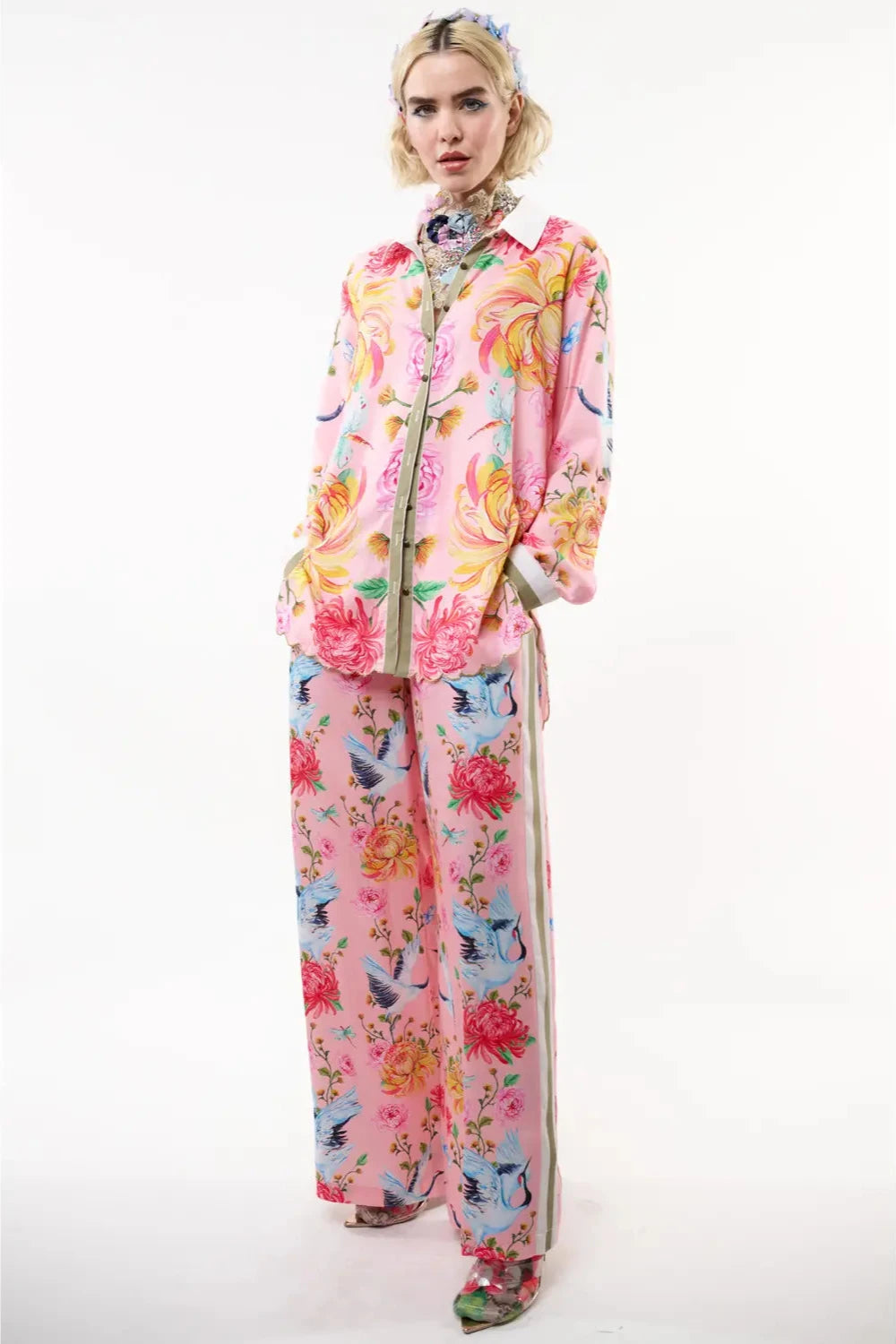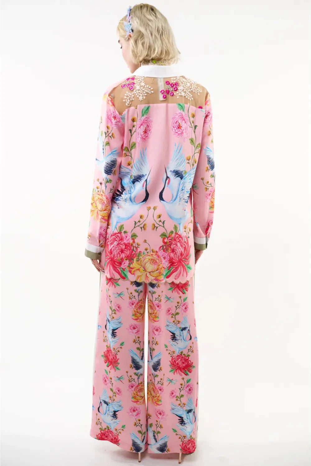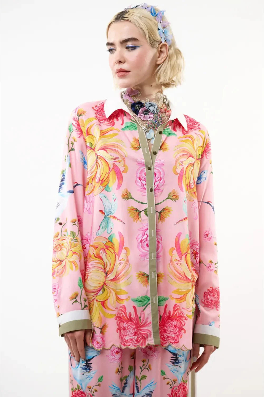 Camisa con estampado floral y de grulla, con canesú trasero de malla bordada. Una combinación de ligereza, textura y detalle.