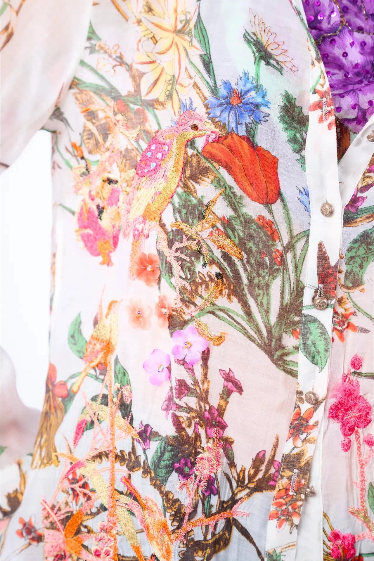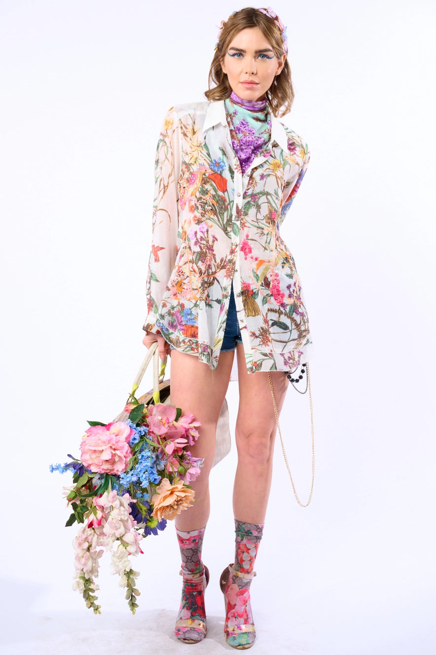Camisa abotonada de manga larga con estampado floral y bordados delicados en la parte delantera, una pieza que combina suavidad y detalle.