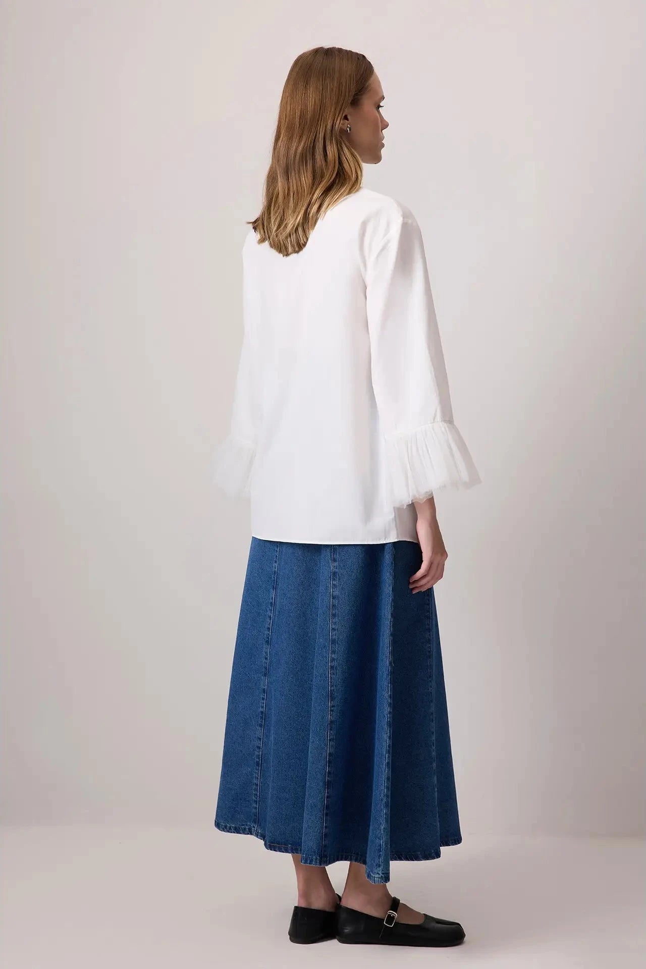 Eleva tu estilo con la camisa Topkapi, una prenda que combina el clásico popelín blanco con detalles modernos. Sus puños de tul y mangas voluminosas aportan un toque femenino y sofisticado, mientras que el cuello estructurado y el ajuste relajado garantizan comodidad y elegancia.