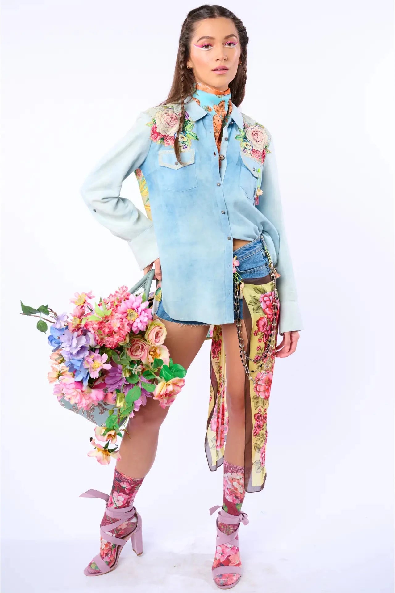 Camisa de denim lavado con bordados florales y apliques en contraste. Una pieza que destaca por sus texturas y el cuidado en los detalles.