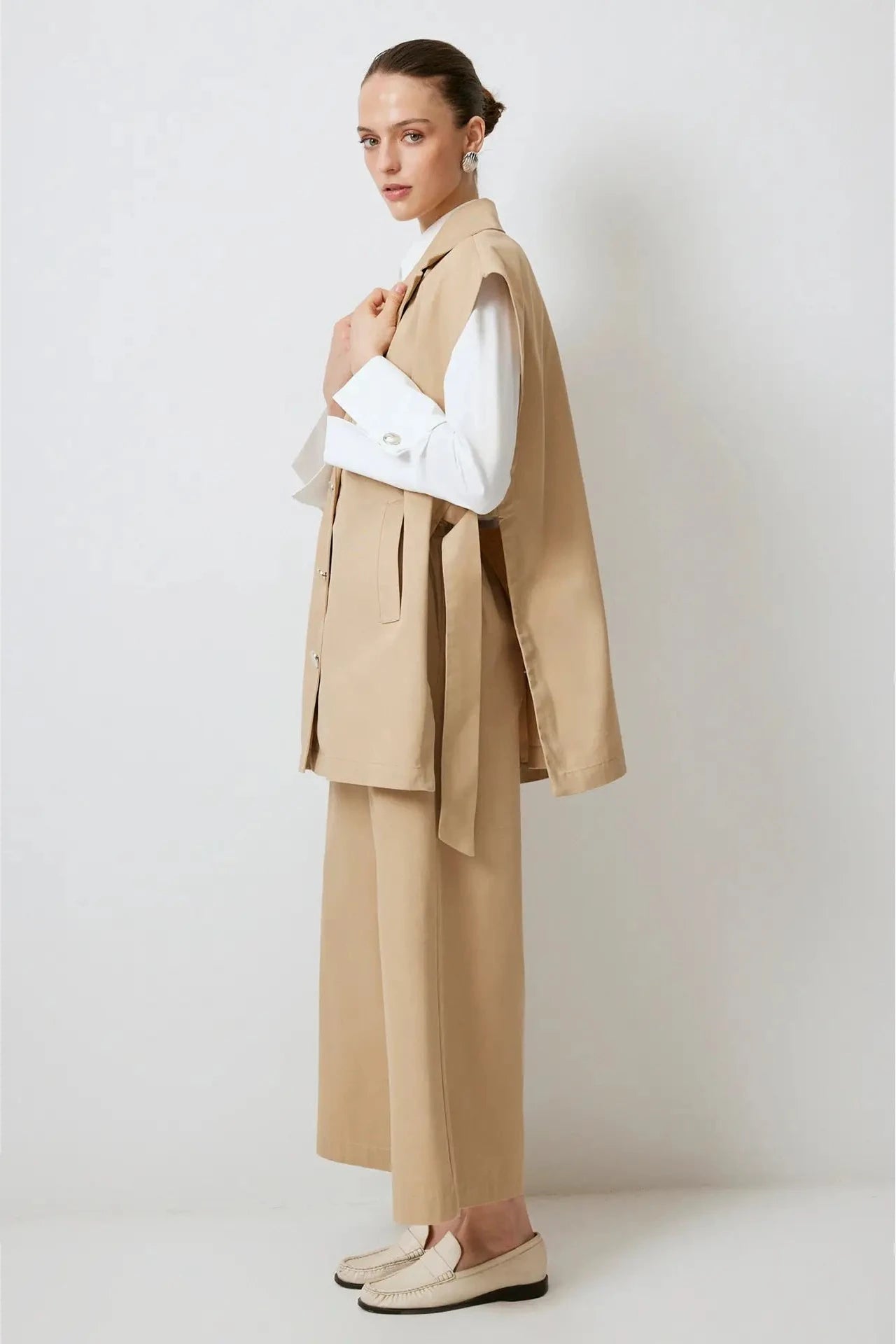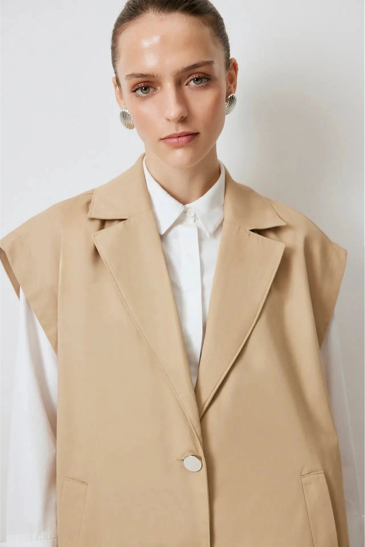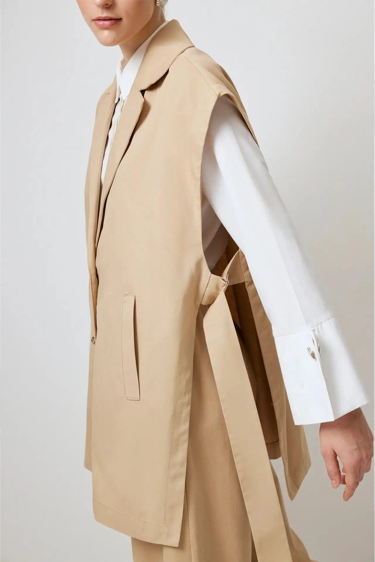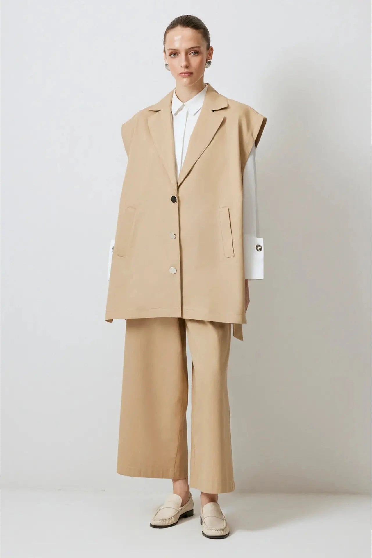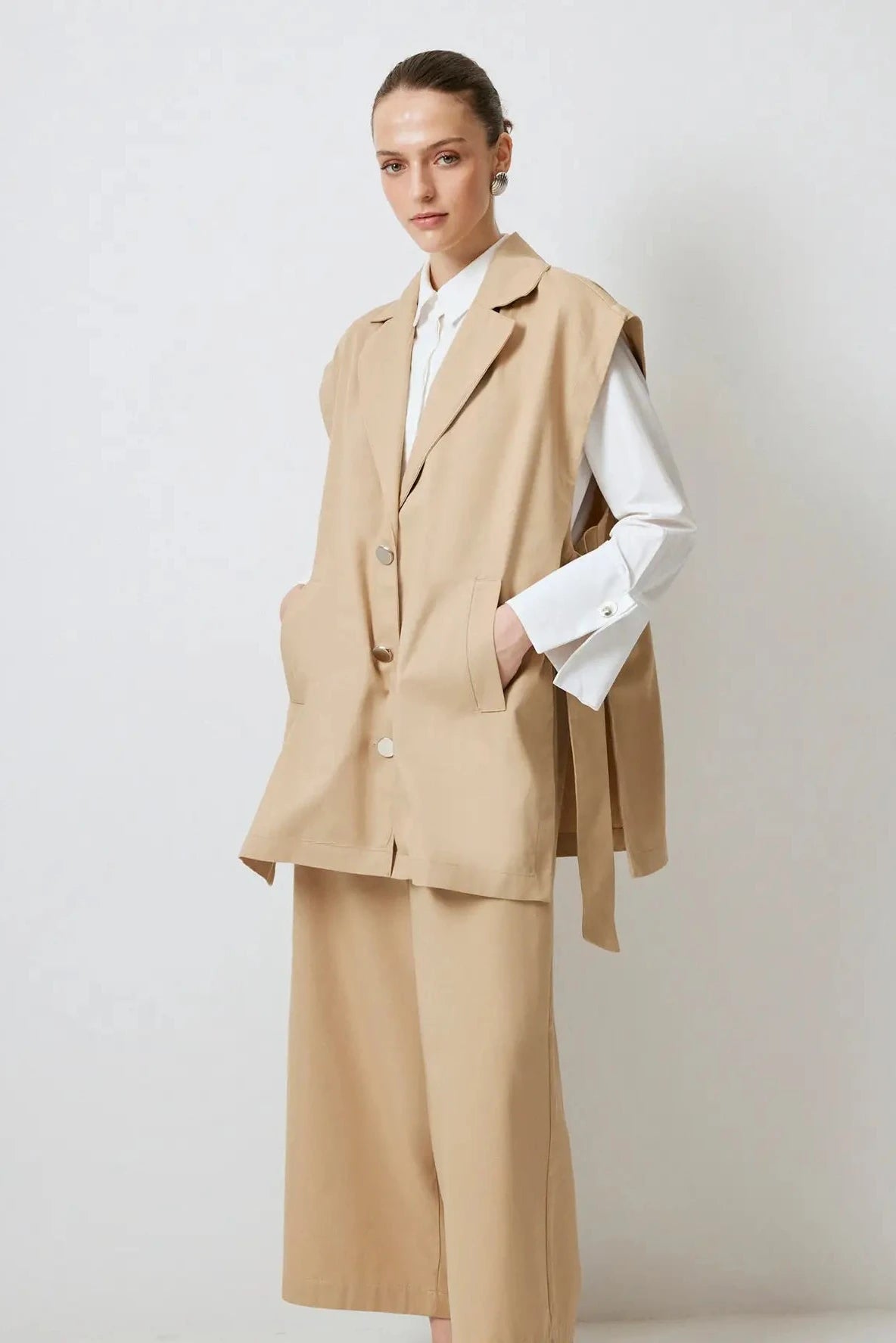 Chaleco de corte oversized y hebillas laterales que aportan un toque utilitario y moderno. Su silueta estructurada realza la figura, manteniendo una estética limpia y versátil. Ideal para superponer sobre camisas o vestidos, es una pieza que combina funcionalidad y estilo con carácter minimalista.