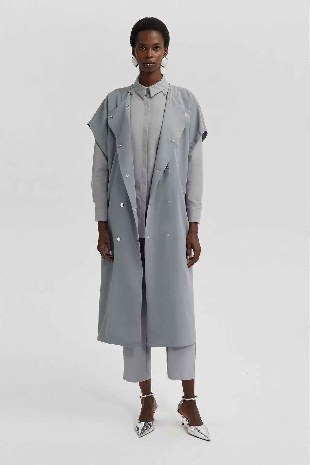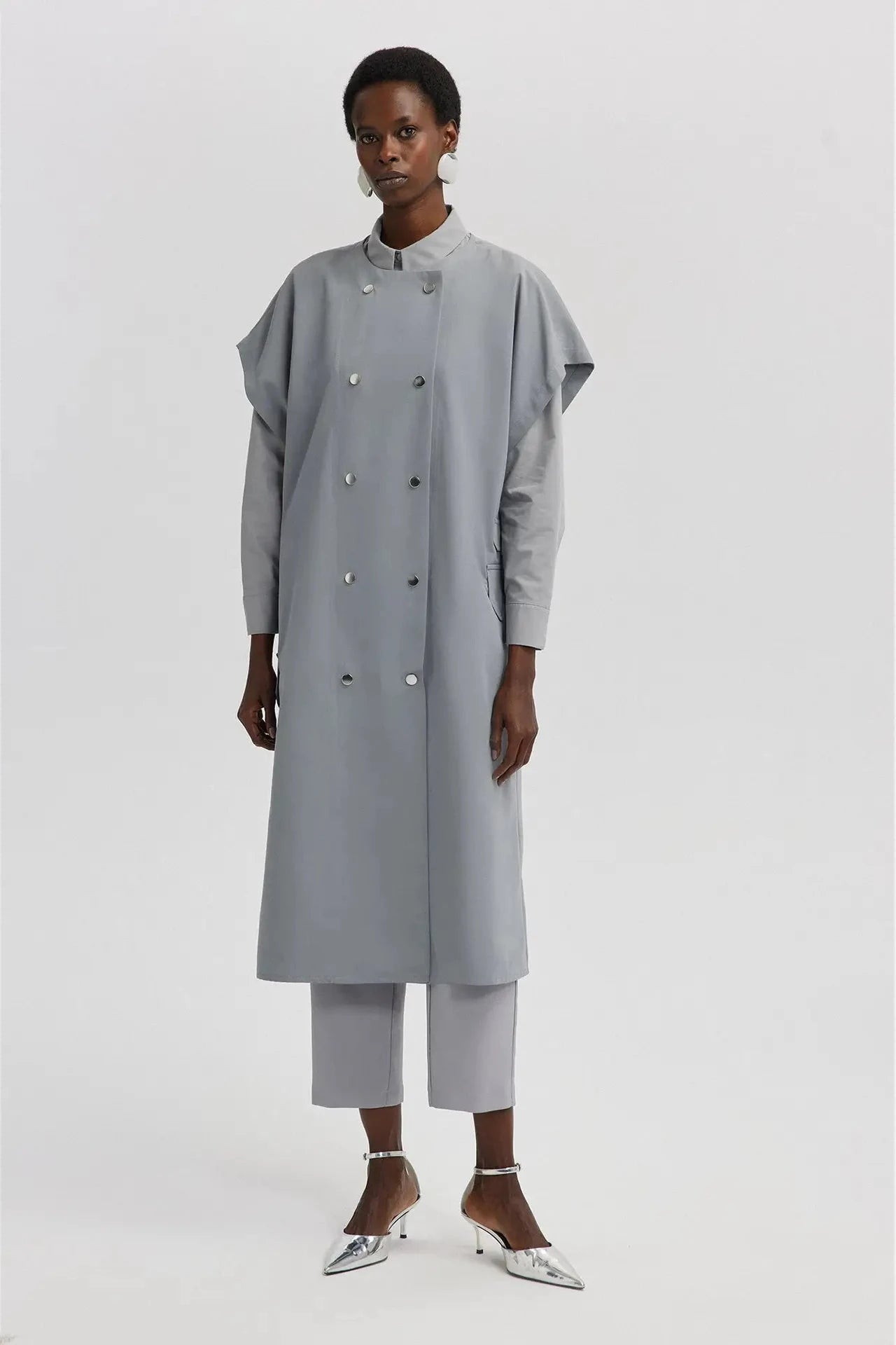 Chaleco largo con doble abotonadura frontal y bolsillos laterales. Su silueta estructurada aporta un aire sofisticado y versátil, ideal para superponer sobre camisas, vestidos o prendas de punto. Una pieza funcional que combina líneas clásicas con un enfoque moderno, perfecta para looks urbanos o de inspiración minimalista.