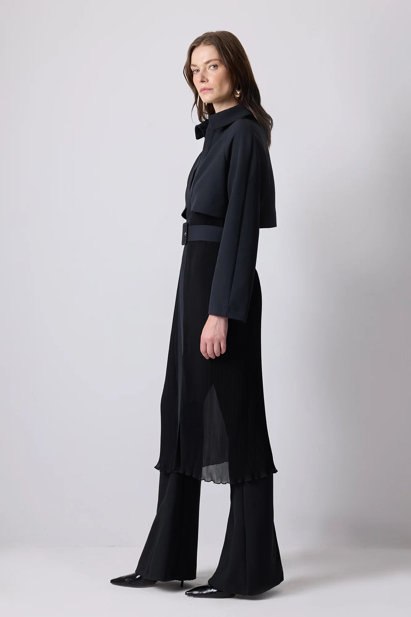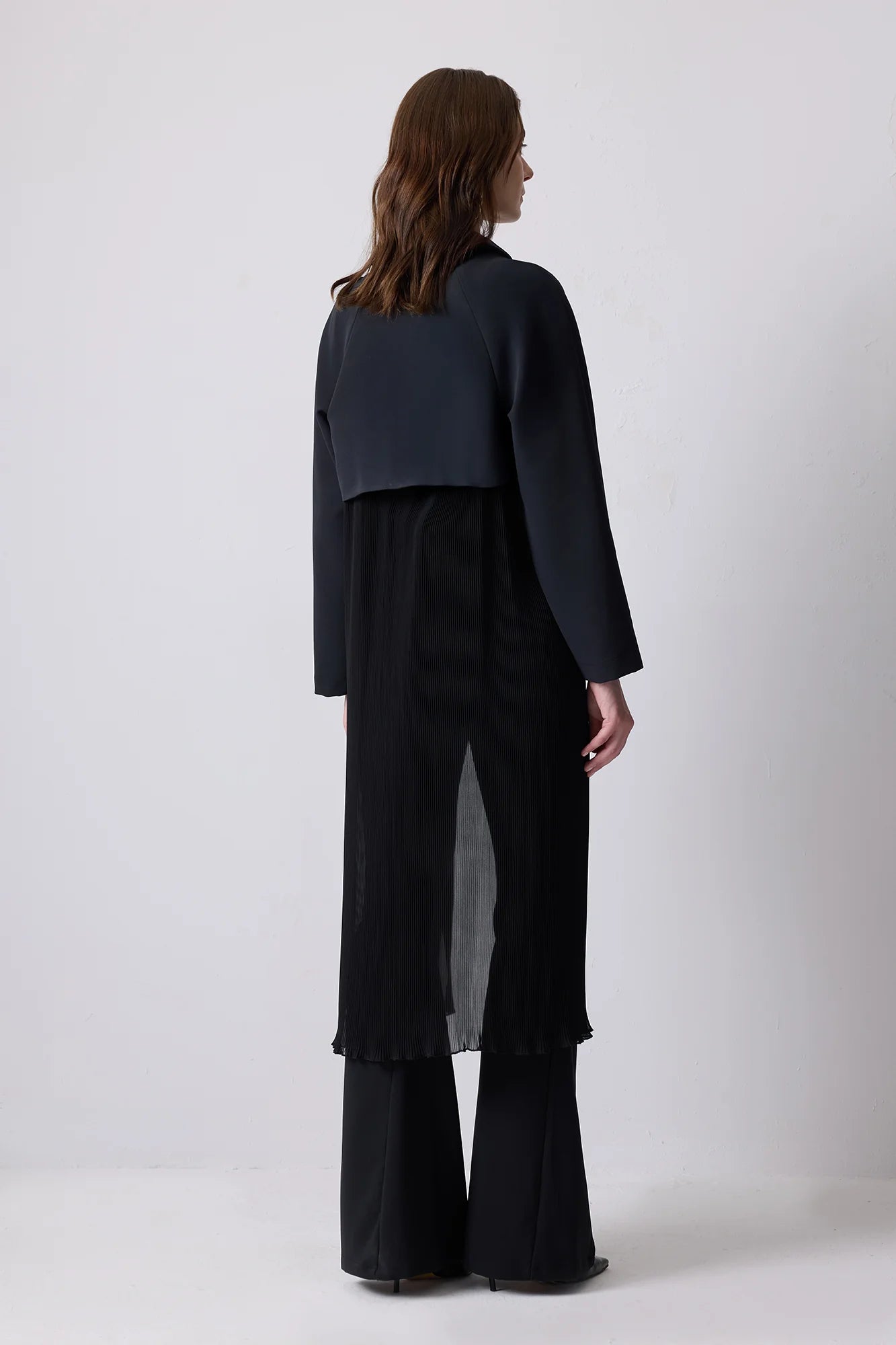 Chaqueta larga con paneles plisados en crepé fluido. Silueta refinada que combina minimalismo y movimiento, ideal para superponer sobre pantalones o vestidos y lucir un estilo elegante de día o noche.