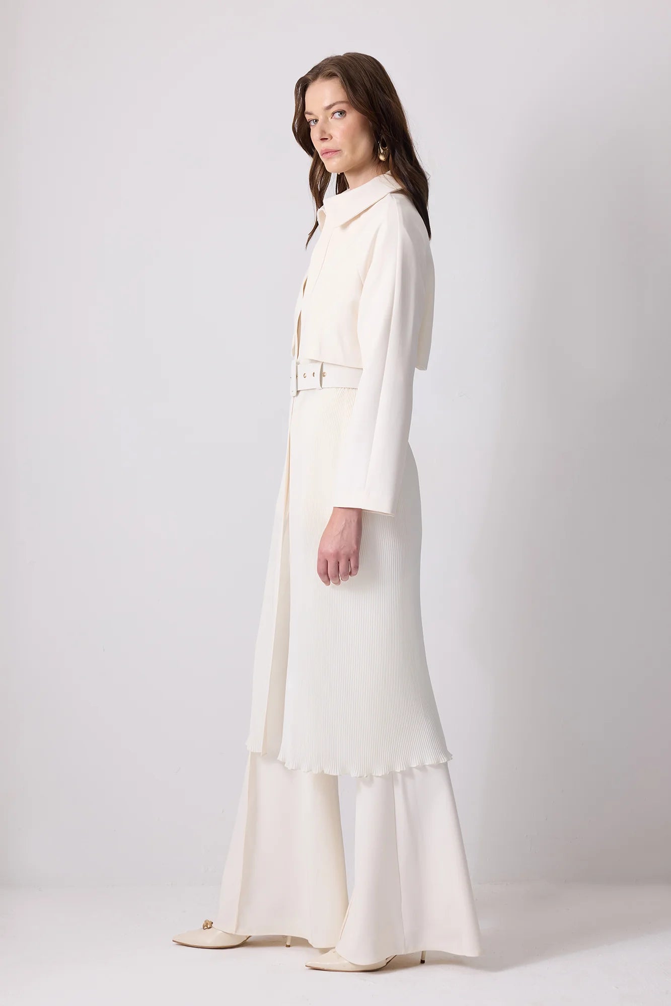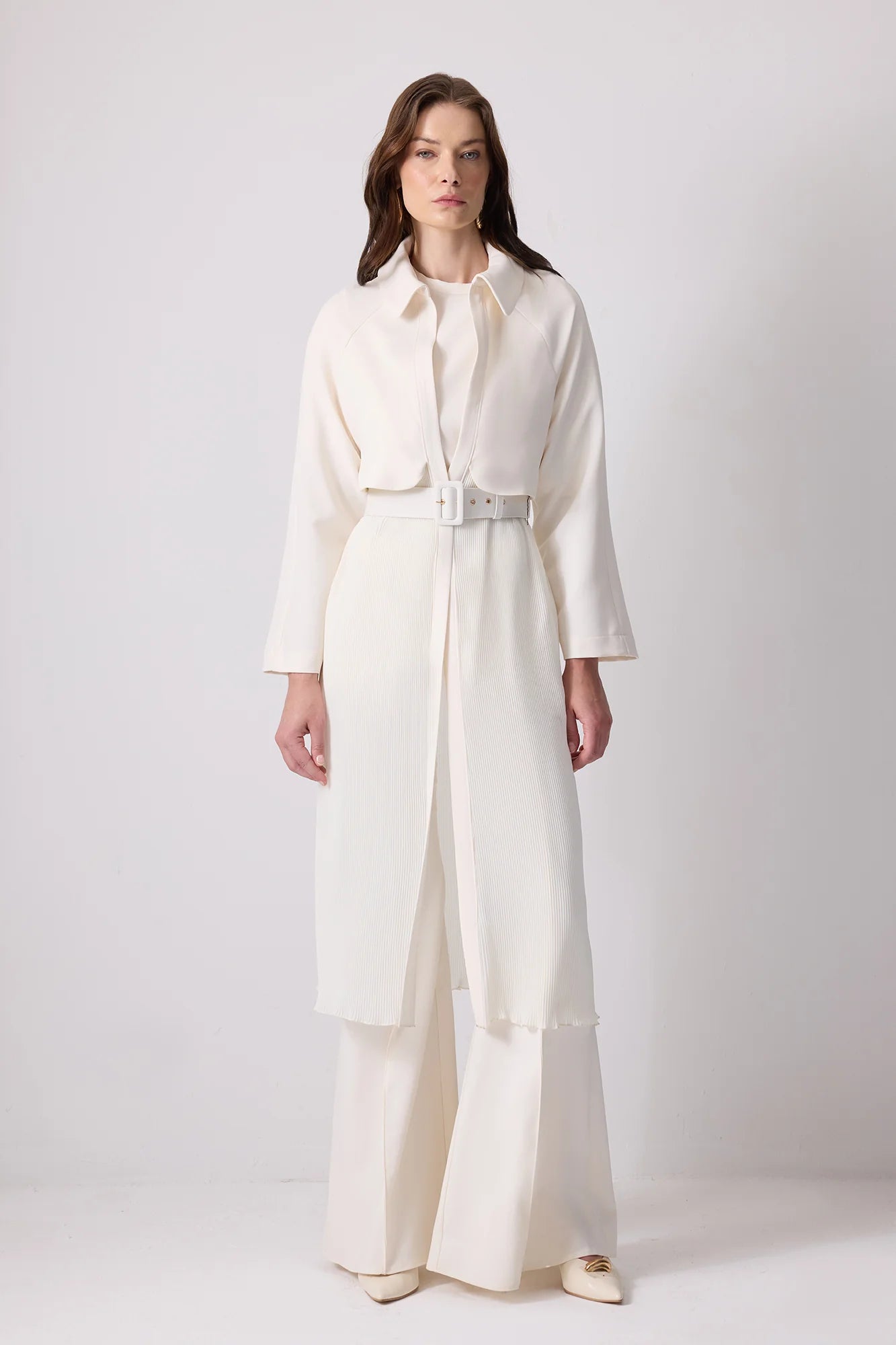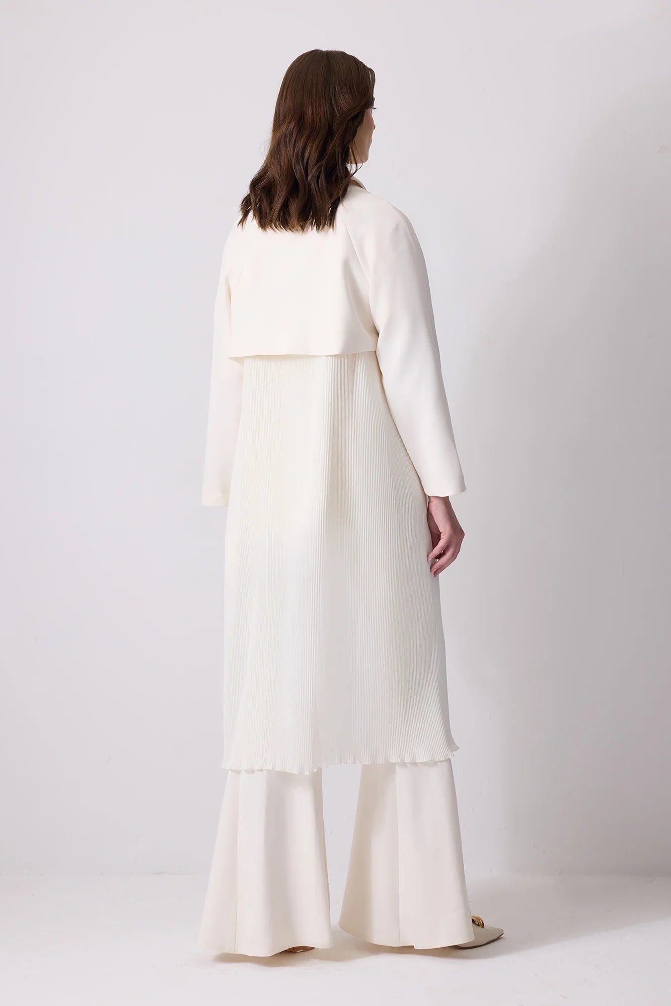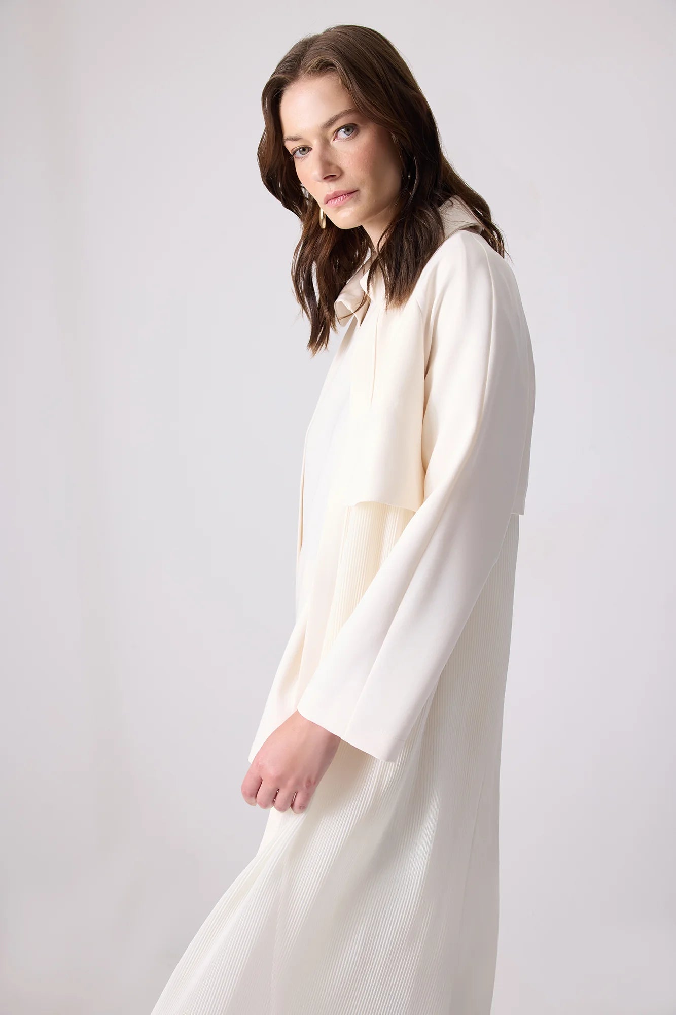 Chaqueta larga con paneles plisados en crepé fluido. Silueta refinada que combina minimalismo y movimiento, ideal para superponer sobre pantalones o vestidos y lucir un estilo elegante de día o noche.
