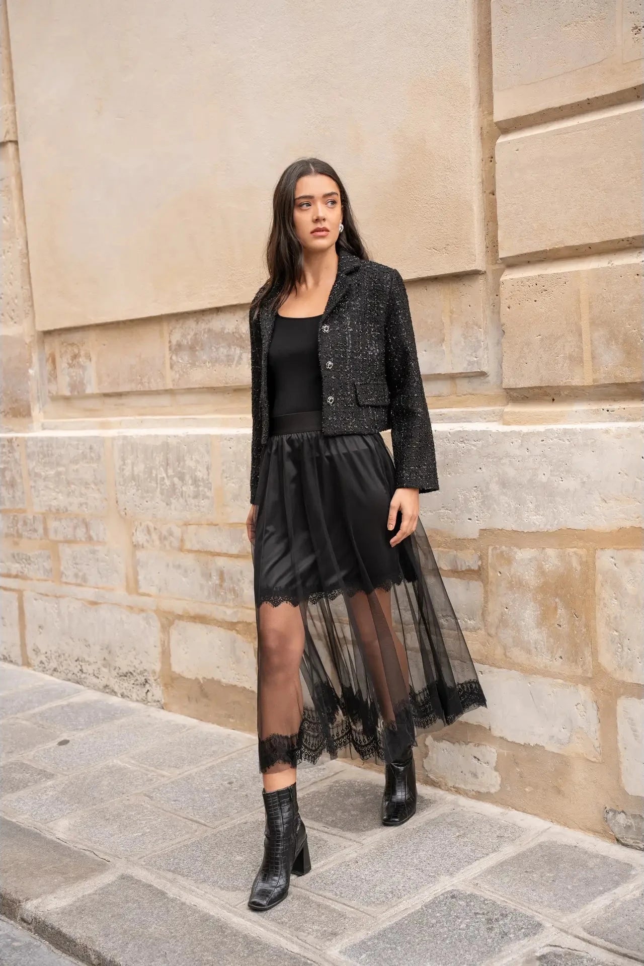 Falda midi fluida con cintura elástica ancha que se adapta cómodamente a la silueta. Su diseño combina un forro corto y opaco con una capa de tul fino en transparencia, rematada con delicado encaje en el bajo, creando un juego elegante y femenino en cada movimiento.
