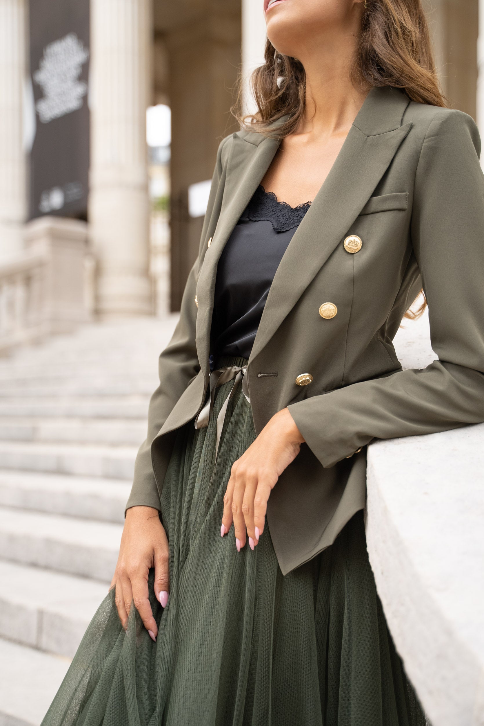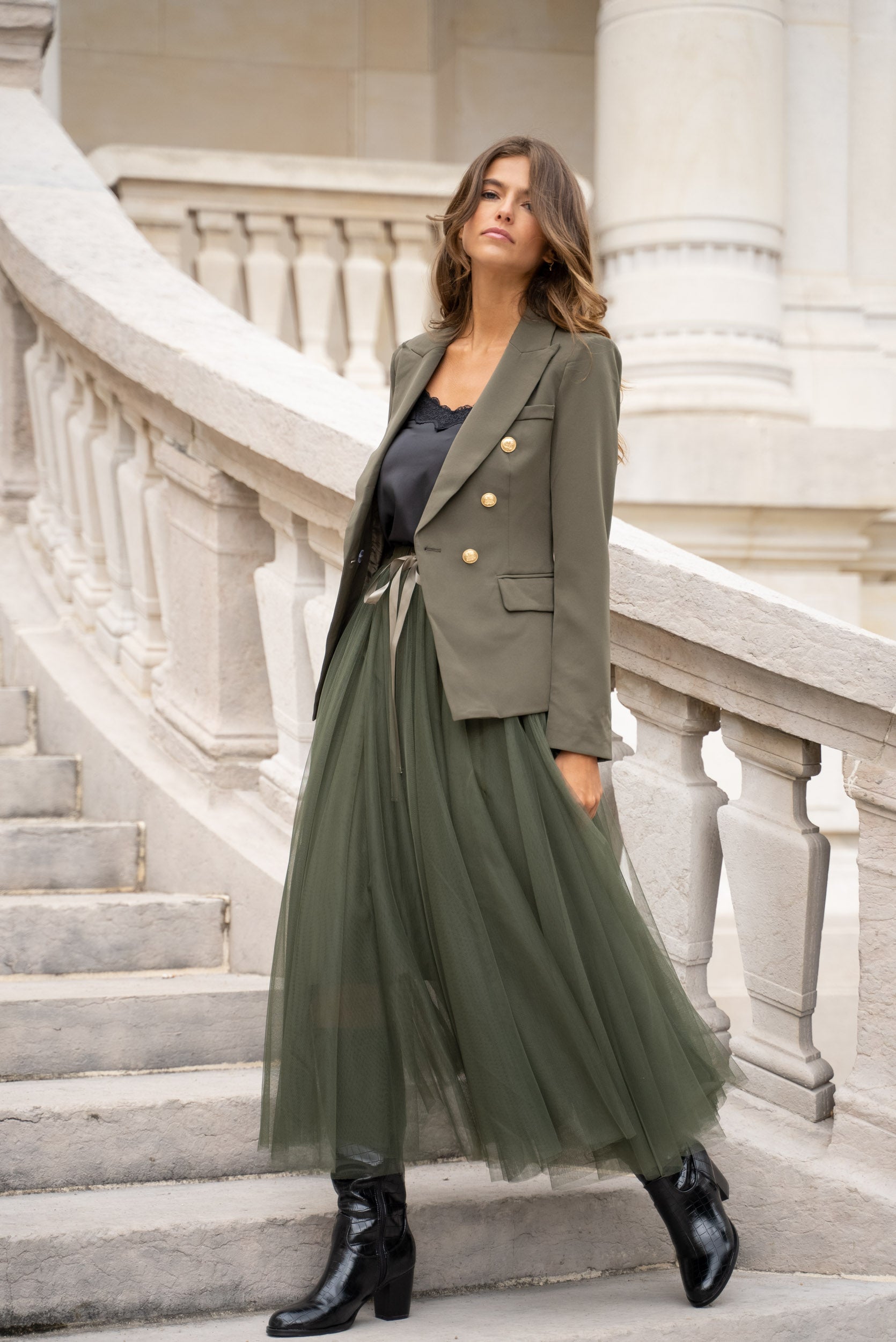 Falda larga de tul, con una fina banda elástica en la cintura. Más de 11m de tul. Jugando con los volúmenes, esta falda emblemática se distingue por un corte evasé, realzado con frunces, ofreciendo un efecto volante en la parte inferior.