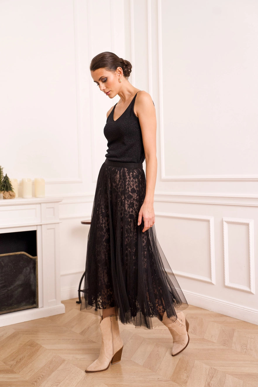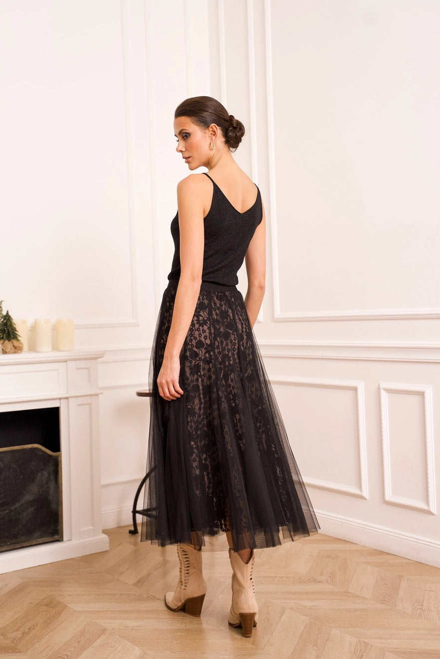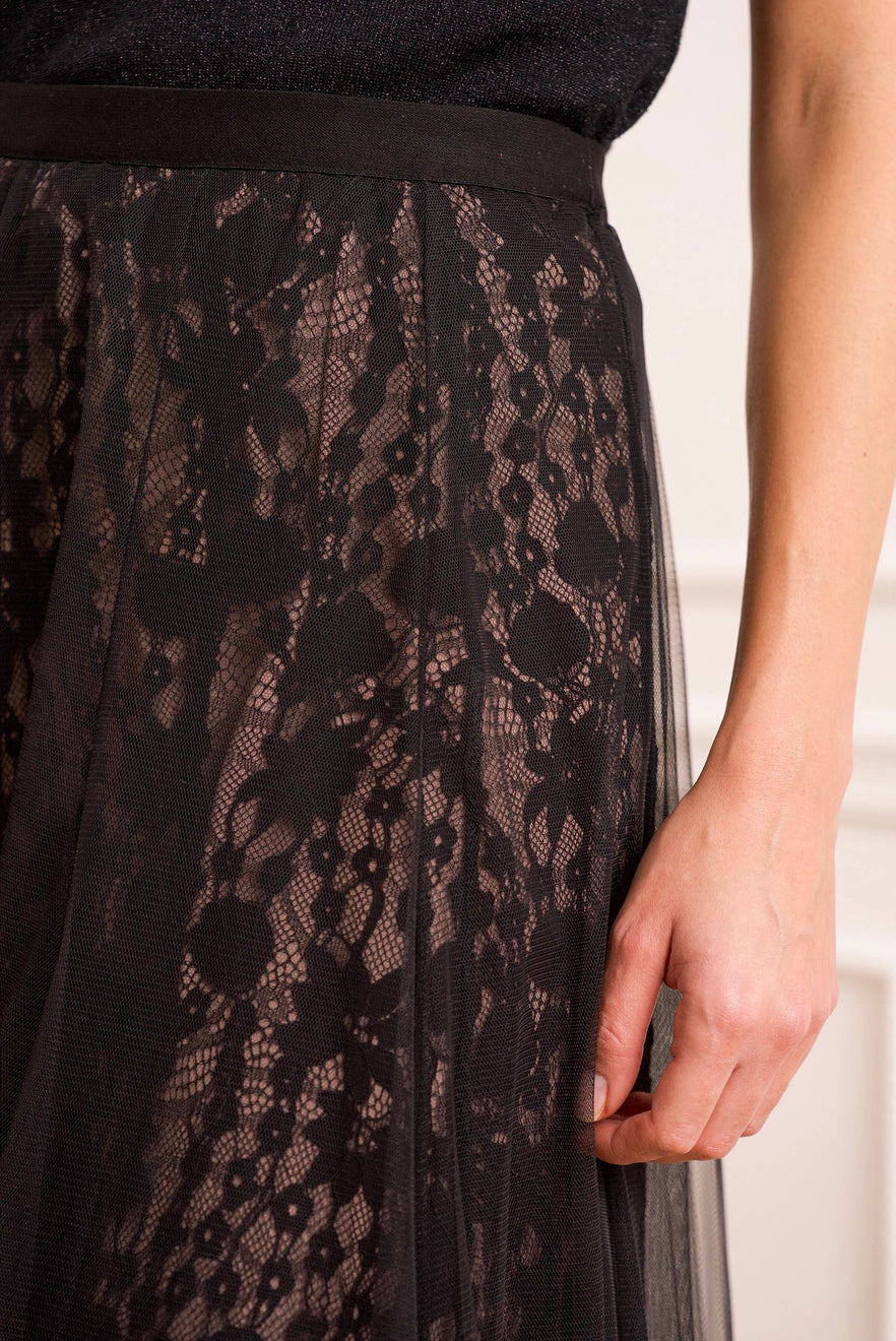 Falda March en nuevo encaje, diseñada en tres capas —tul, encaje y forro— que aportan volumen ligero con efecto volante. La cintura elástica asegura ajuste cómodo y favorecedor.