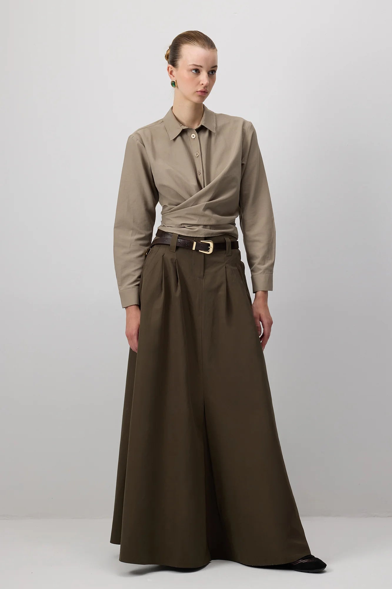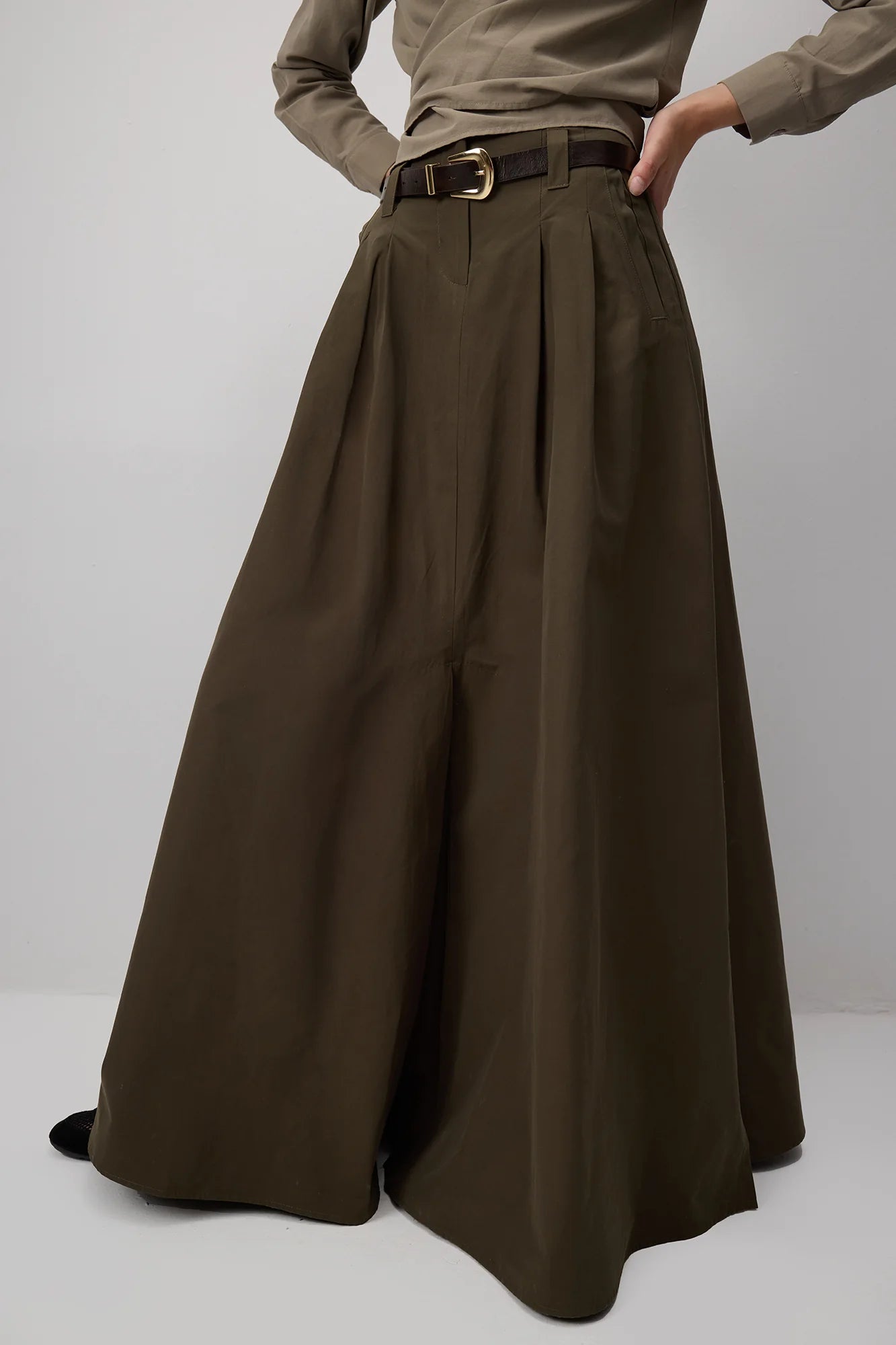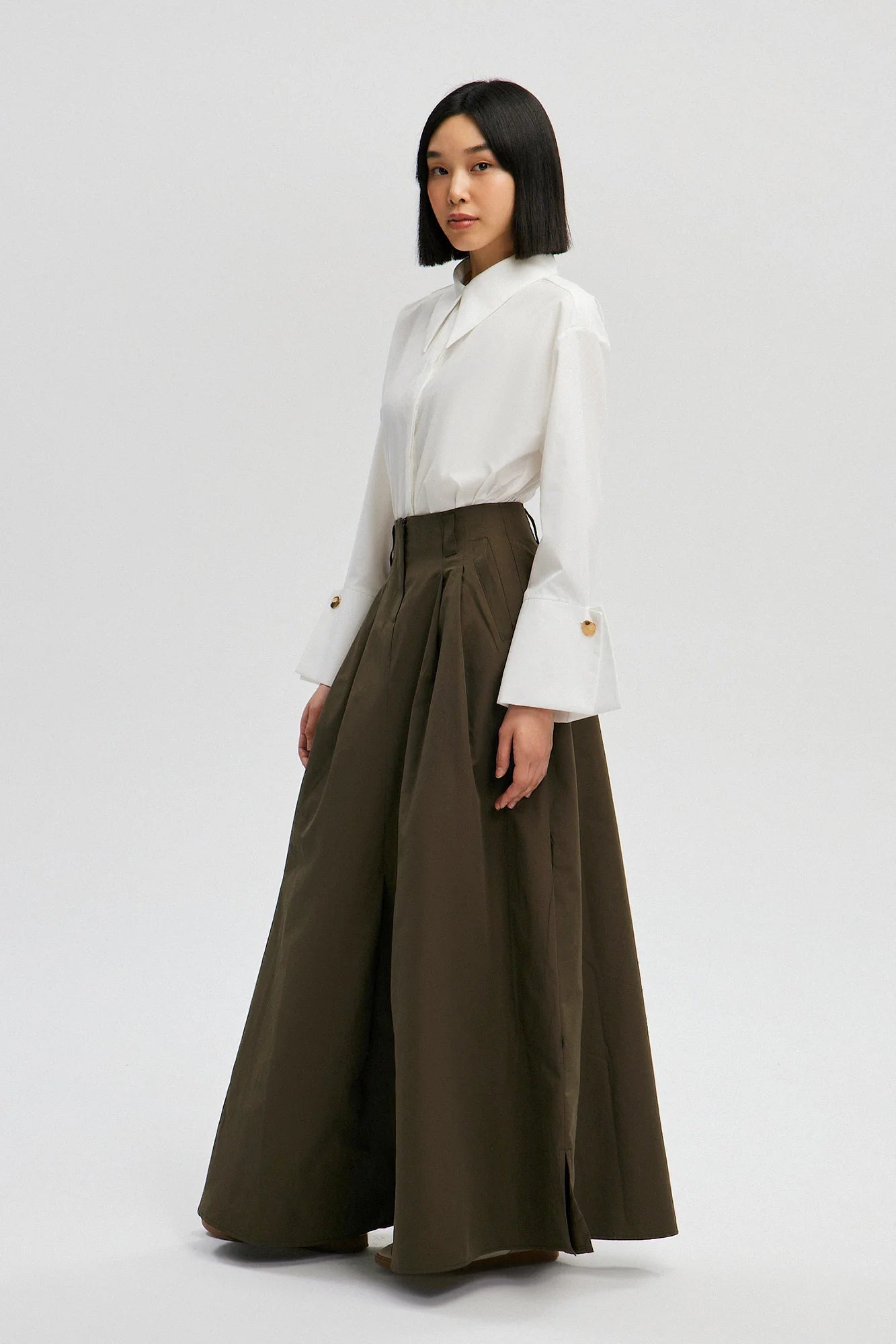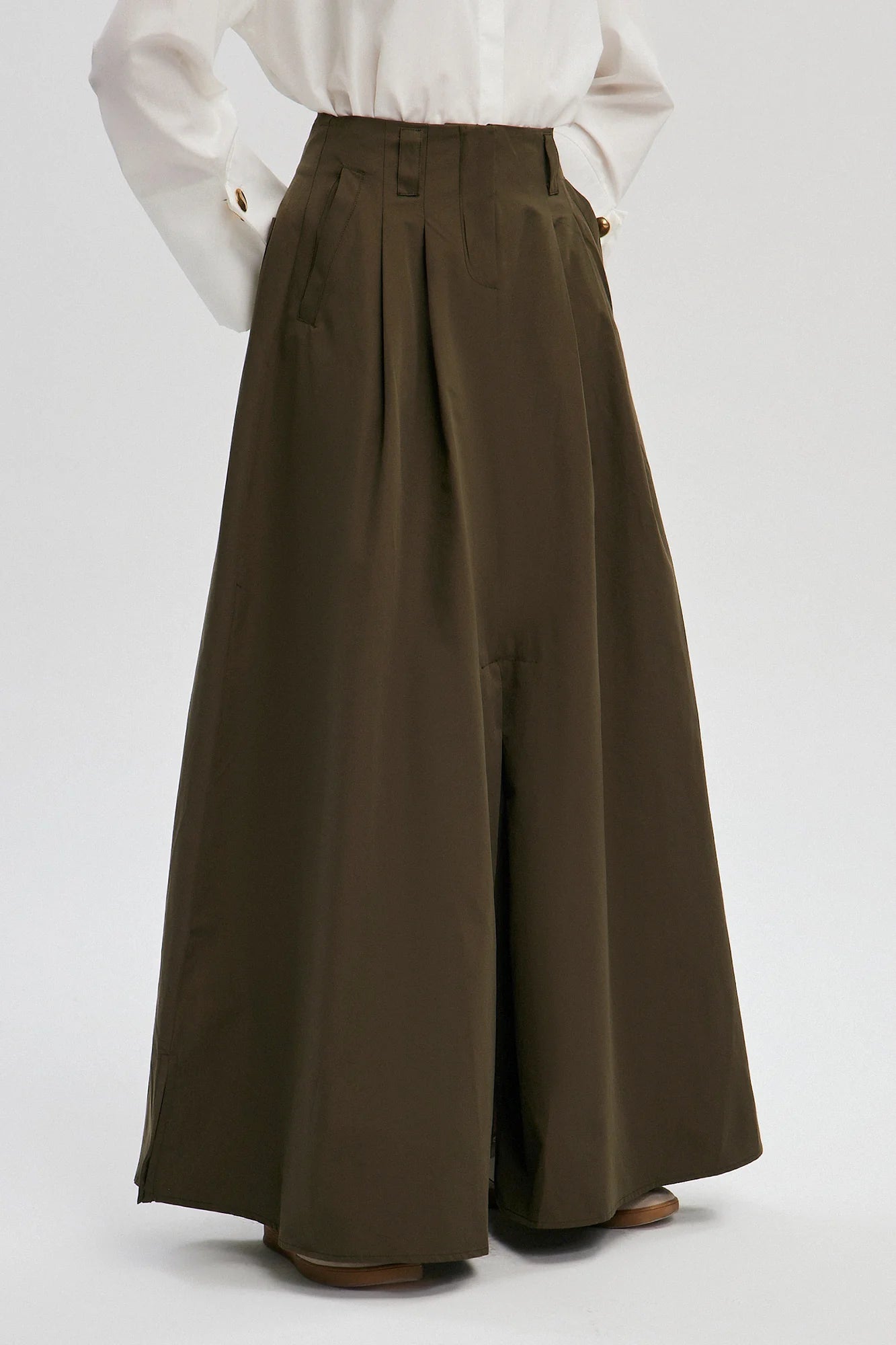 Maxi falda de pierna ancha con cintura alta, pliegues marcados y silueta en línea A. Combina el dramatismo de una falda con la comodidad de un pantalón amplio, logrando una pieza versátil para looks casuales o elegantes.