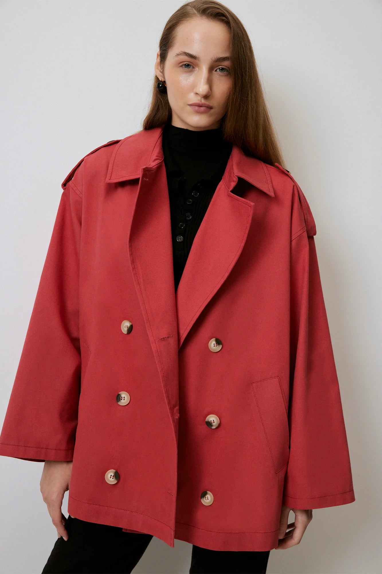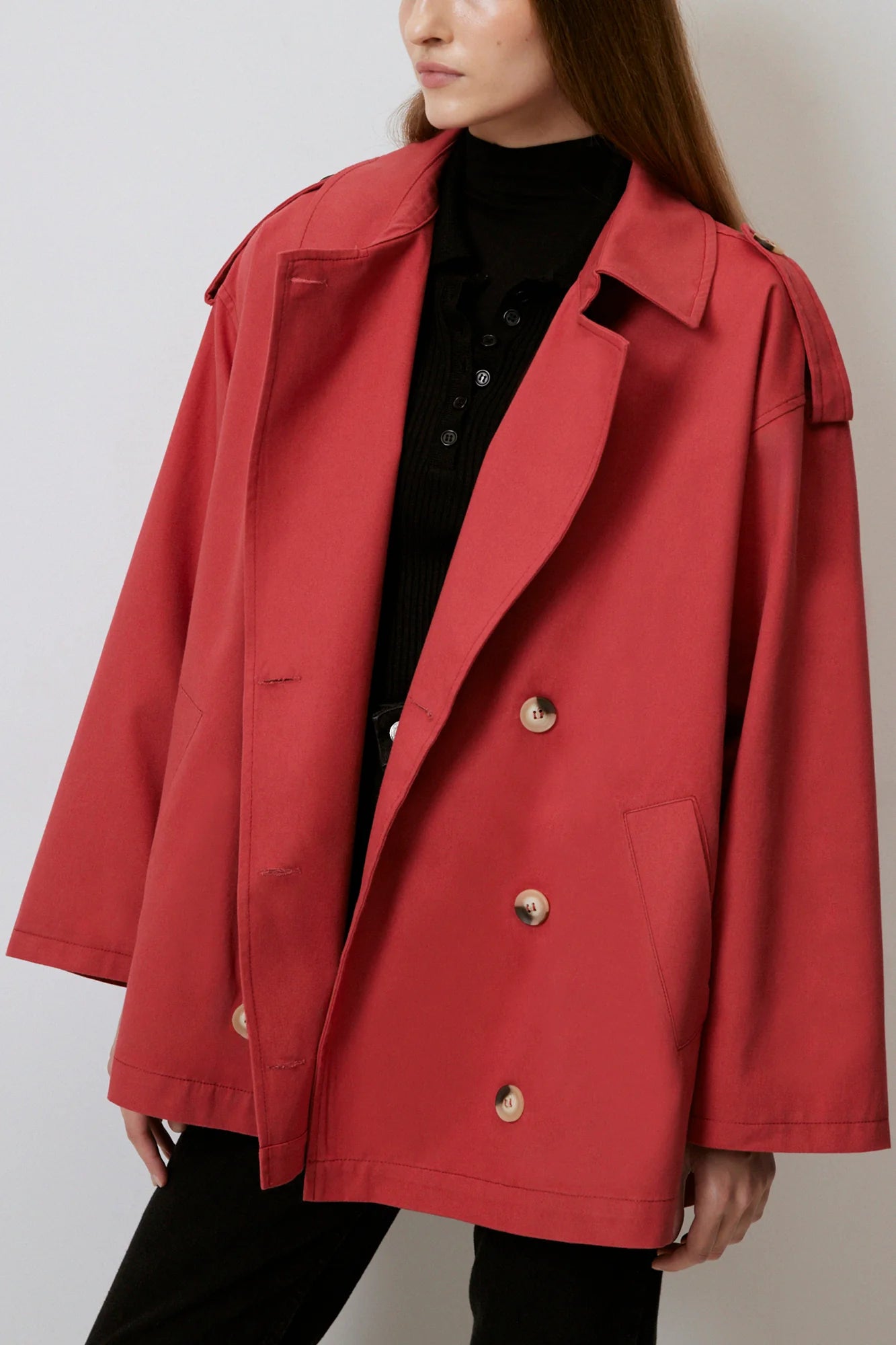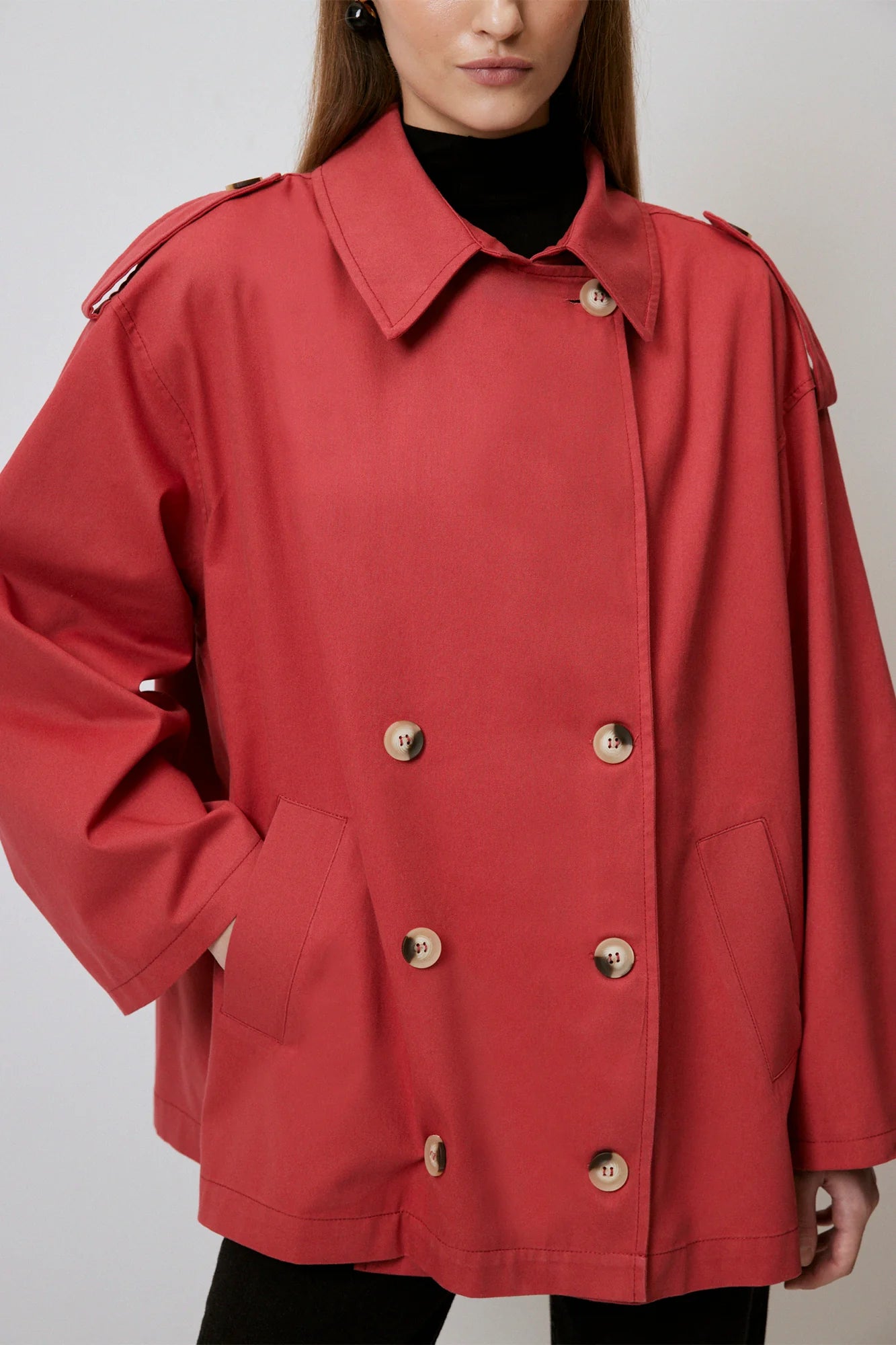 Gabardina corta de doble botonadura en rojo audaz, confeccionada en algodón 100% premium. Silueta relajada con mangas anchas, charreteras y corte oversize, ideal para superponer. Detalles prácticos como cierre frontal y bolsillos laterales hacen de esta pieza versátil perfecta para looks urbanos o casuales elevados.