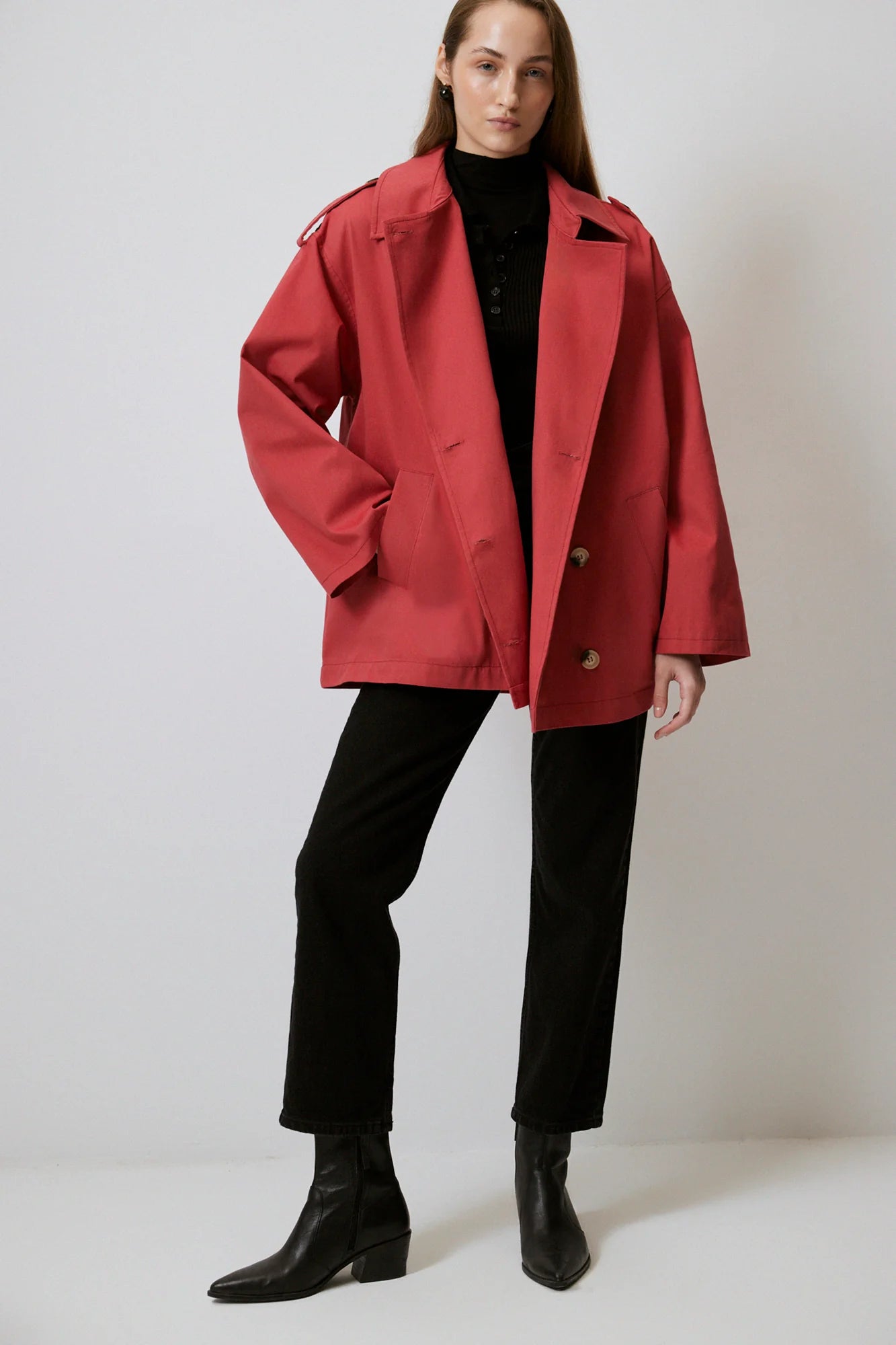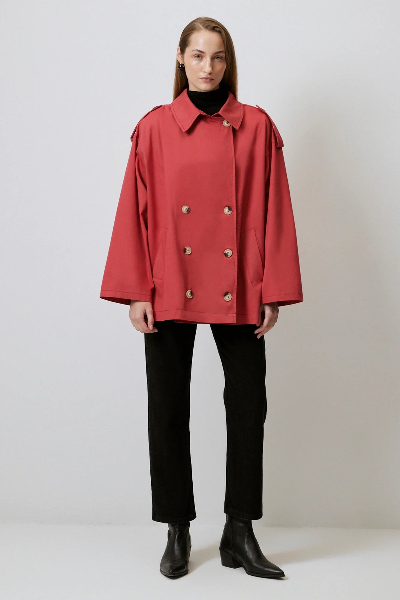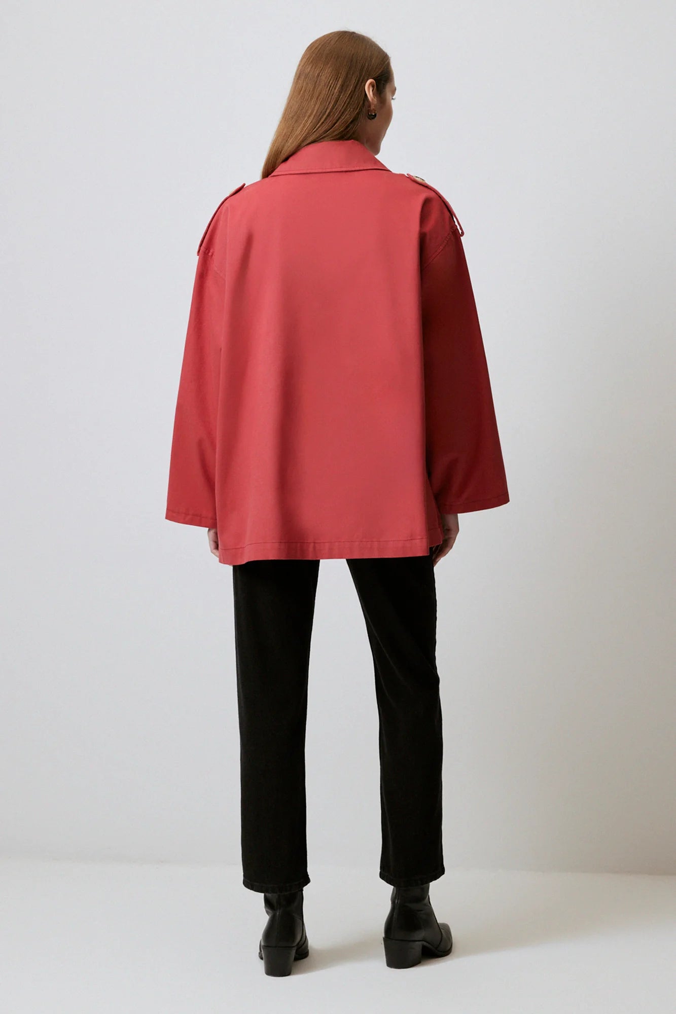 Gabardina corta de doble botonadura en rojo audaz, confeccionada en algodón 100% premium. Silueta relajada con mangas anchas, charreteras y corte oversize, ideal para superponer. Detalles prácticos como cierre frontal y bolsillos laterales hacen de esta pieza versátil perfecta para looks urbanos o casuales elevados.