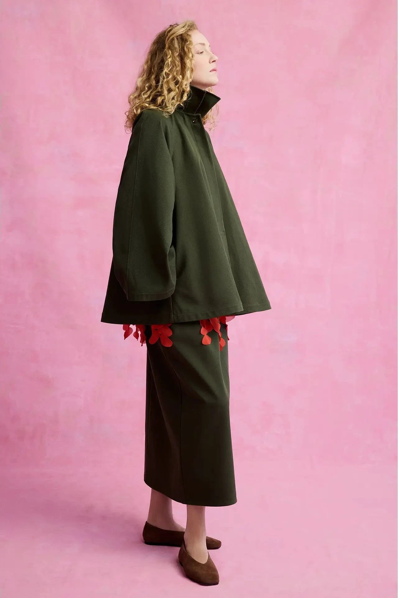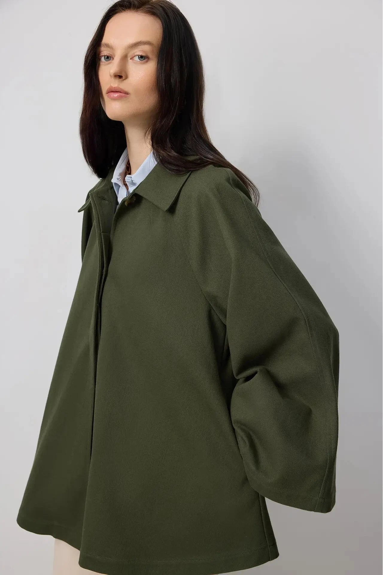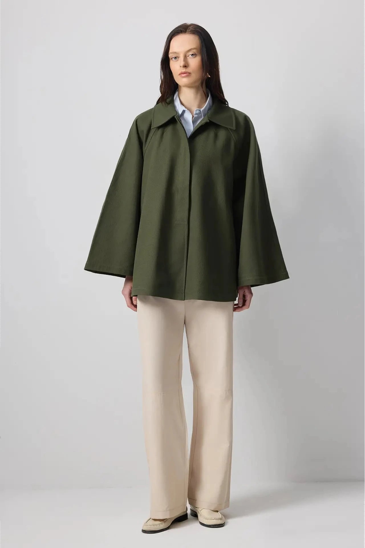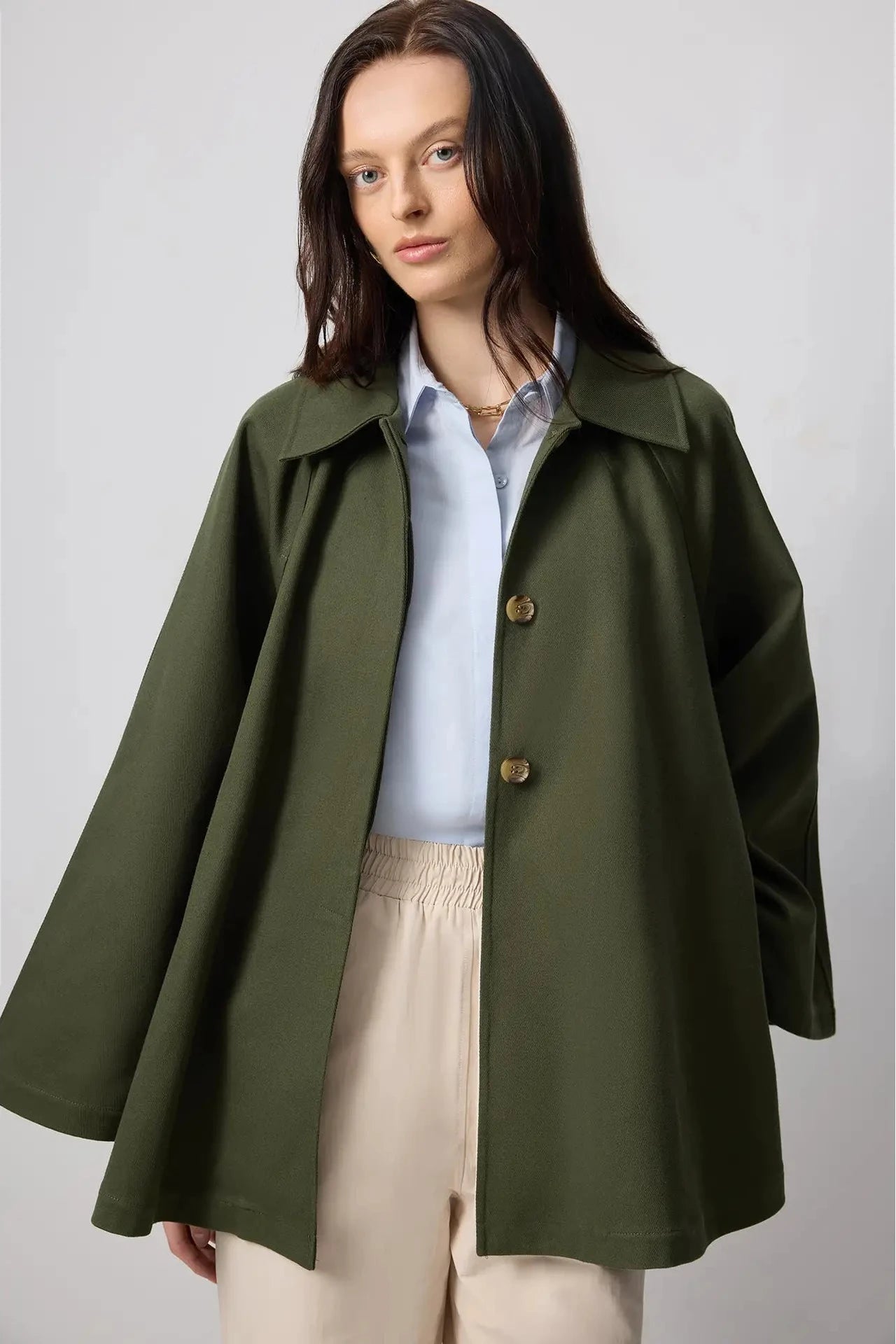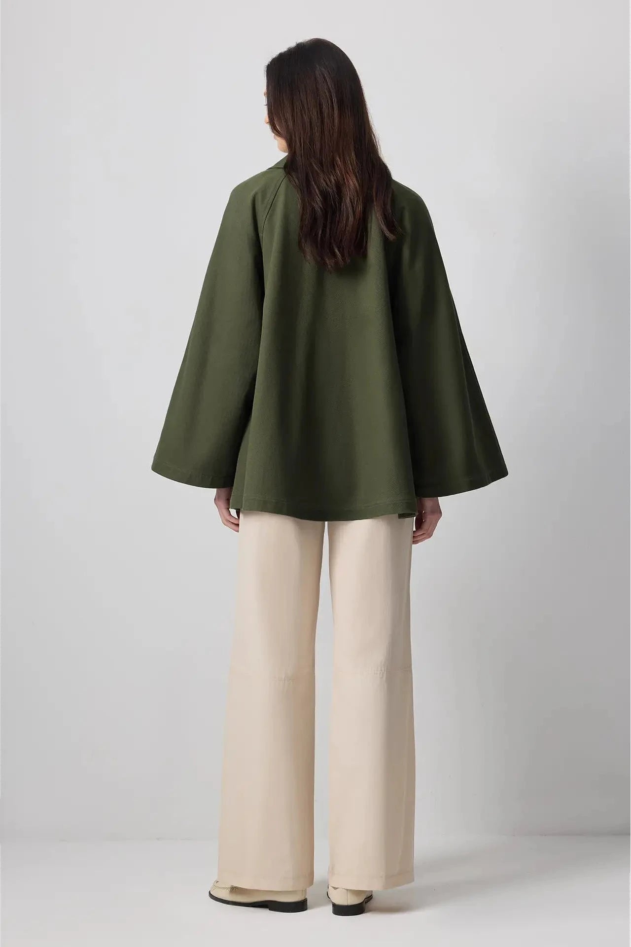 Una reinterpretación moderna de la gabardina clásica. Confeccionada en 100% algodón premium, combina estructura y ligereza en un tono verde oliva. Su corte en línea A y mangas acampanadas aportan un aire minimalista y actual, ideal para looks casual chic o de inspiración urbana.