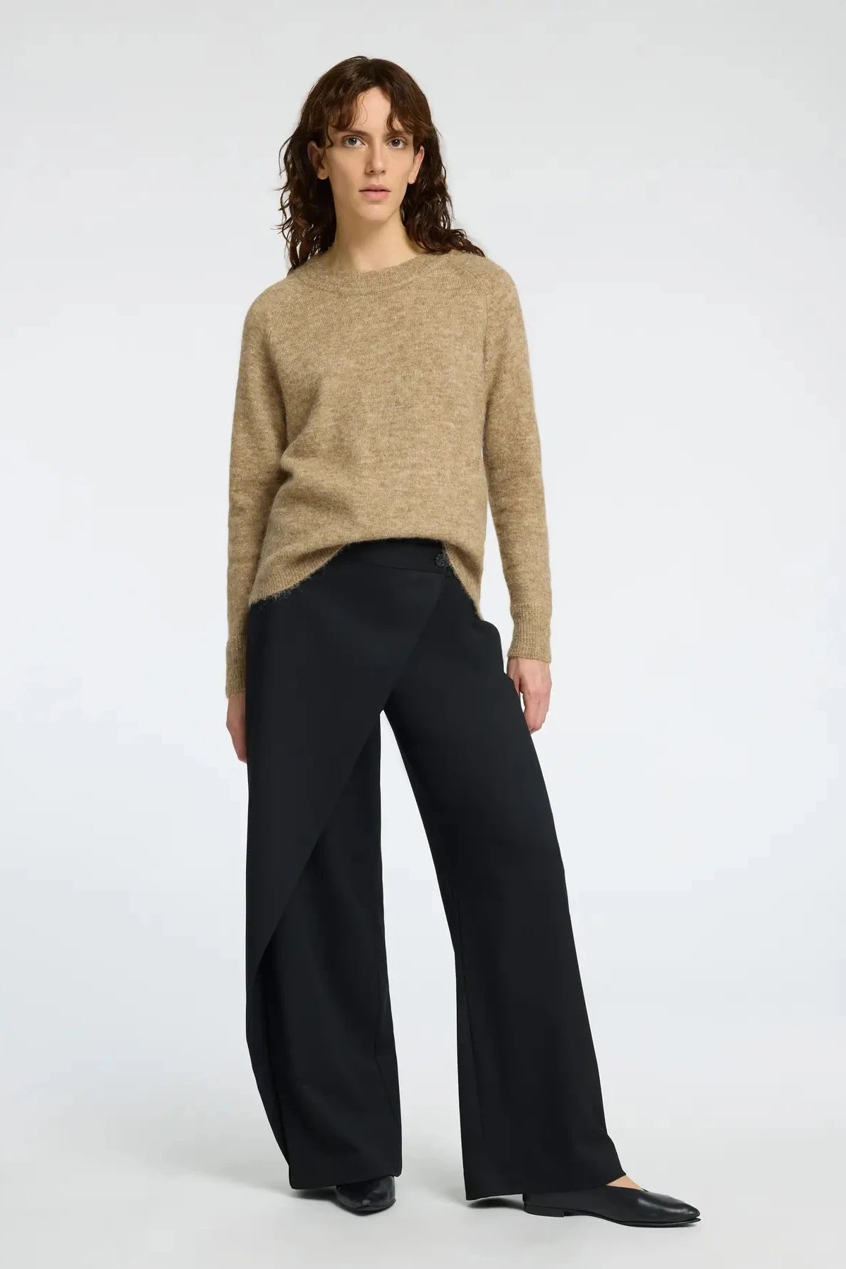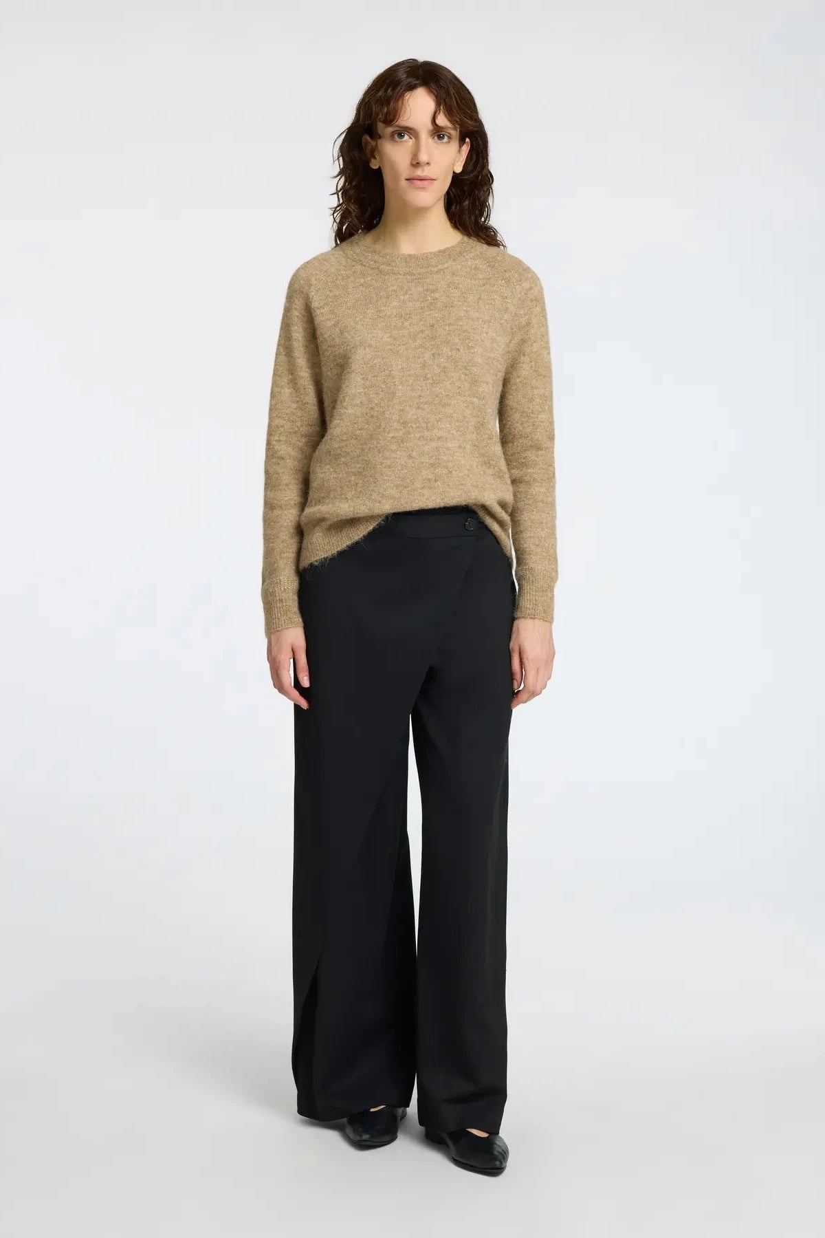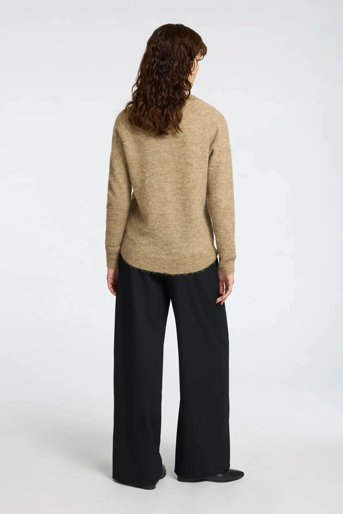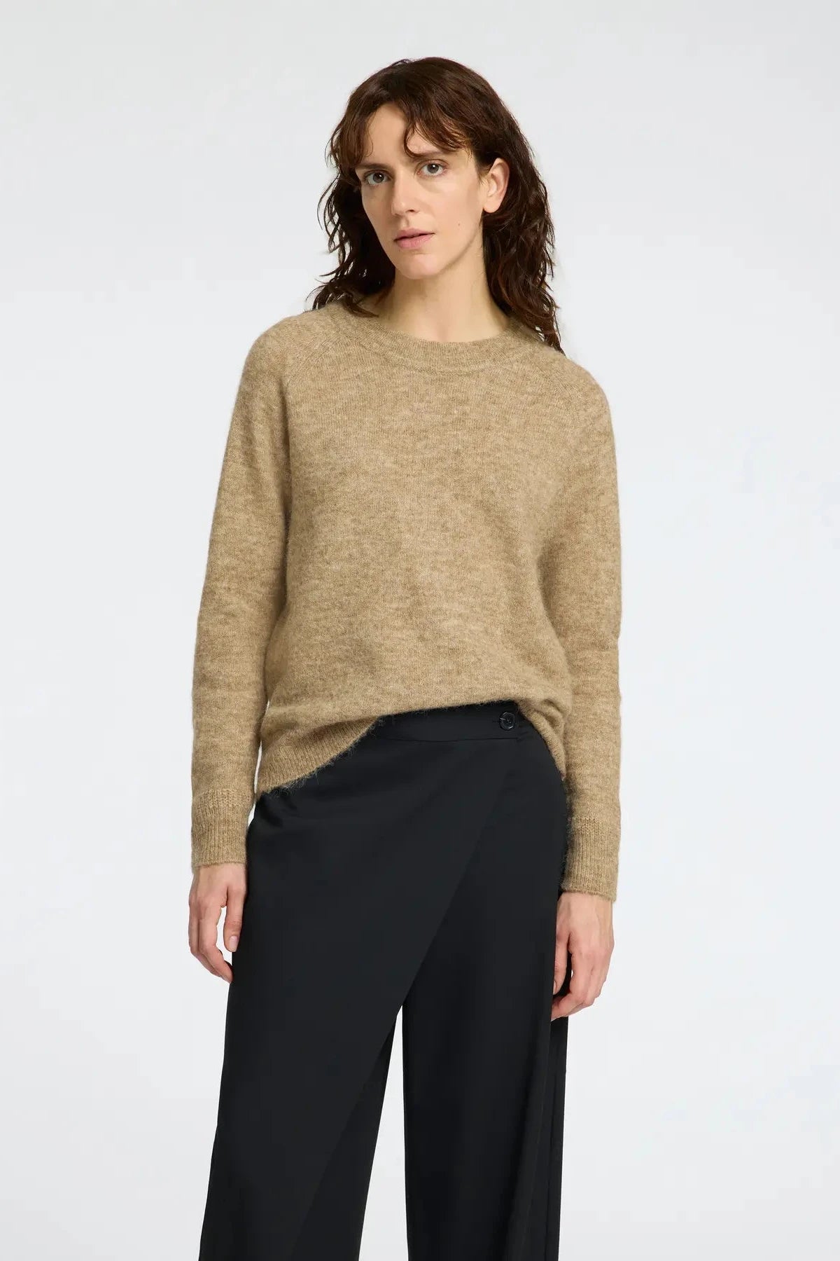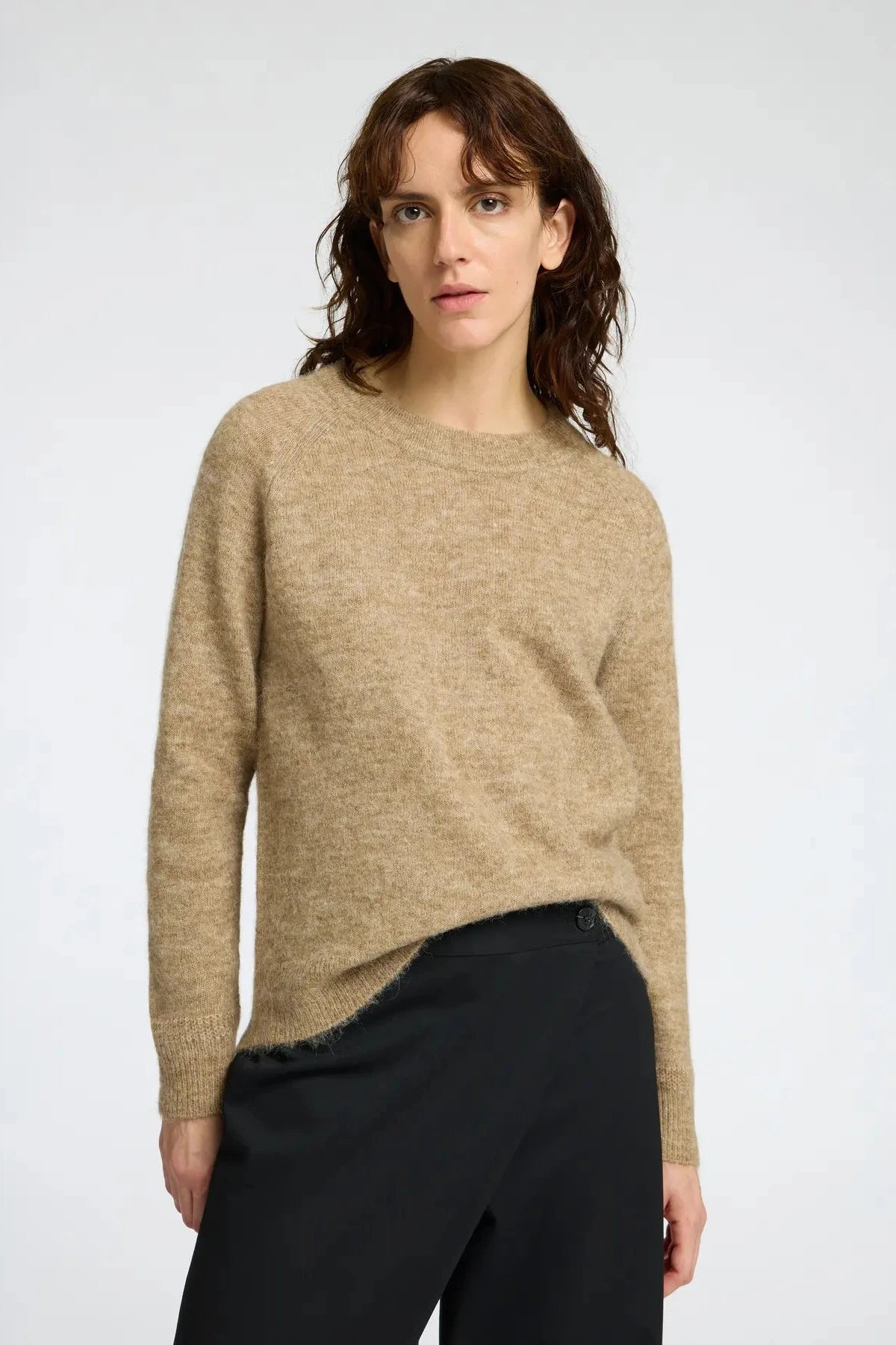 Jersey confeccionado con una mezcla suave de alpaca y lana, con un toque de elasticidad para una mayor comodidad. El diseño de mangas largas tipo raglán acaba en unos puños ajustados de canalé, a juego con el cuello redondo y el dobladillo.