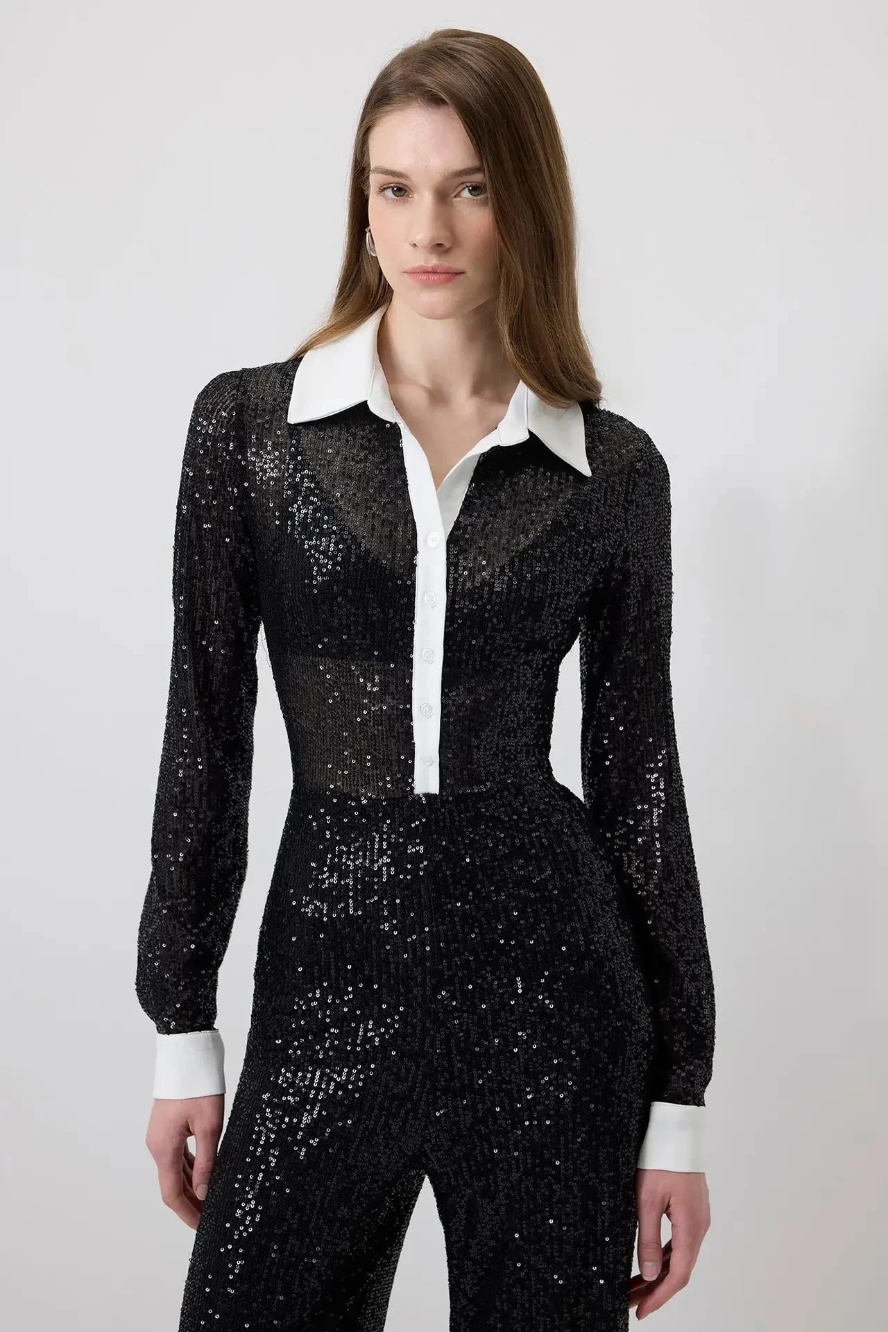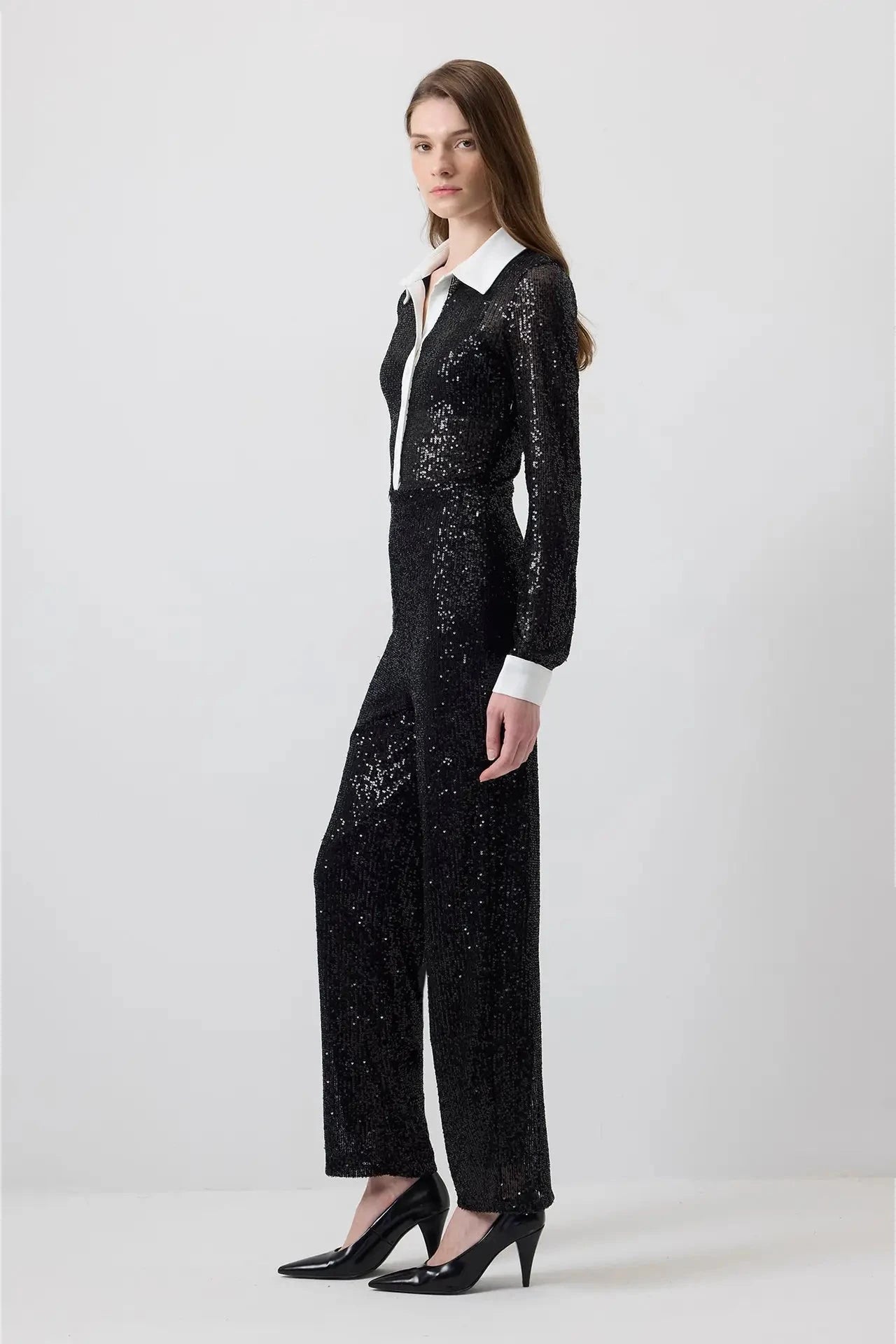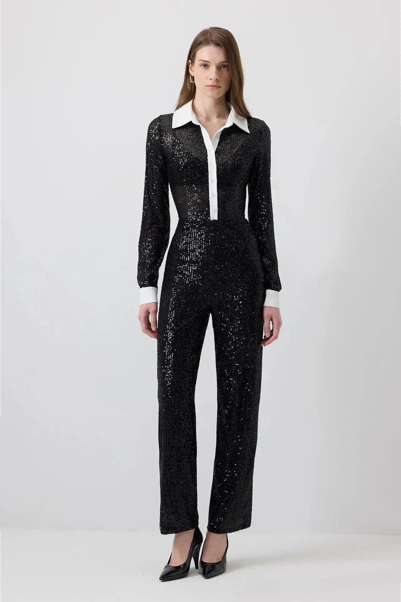 Mono negro con lentejuelas y contraste en cuello y puños blancos. Silueta recta con cierre abotonado que combina sastrería clásica y glamour moderno. Una pieza audaz ideal para la noche y ocasiones especiales.