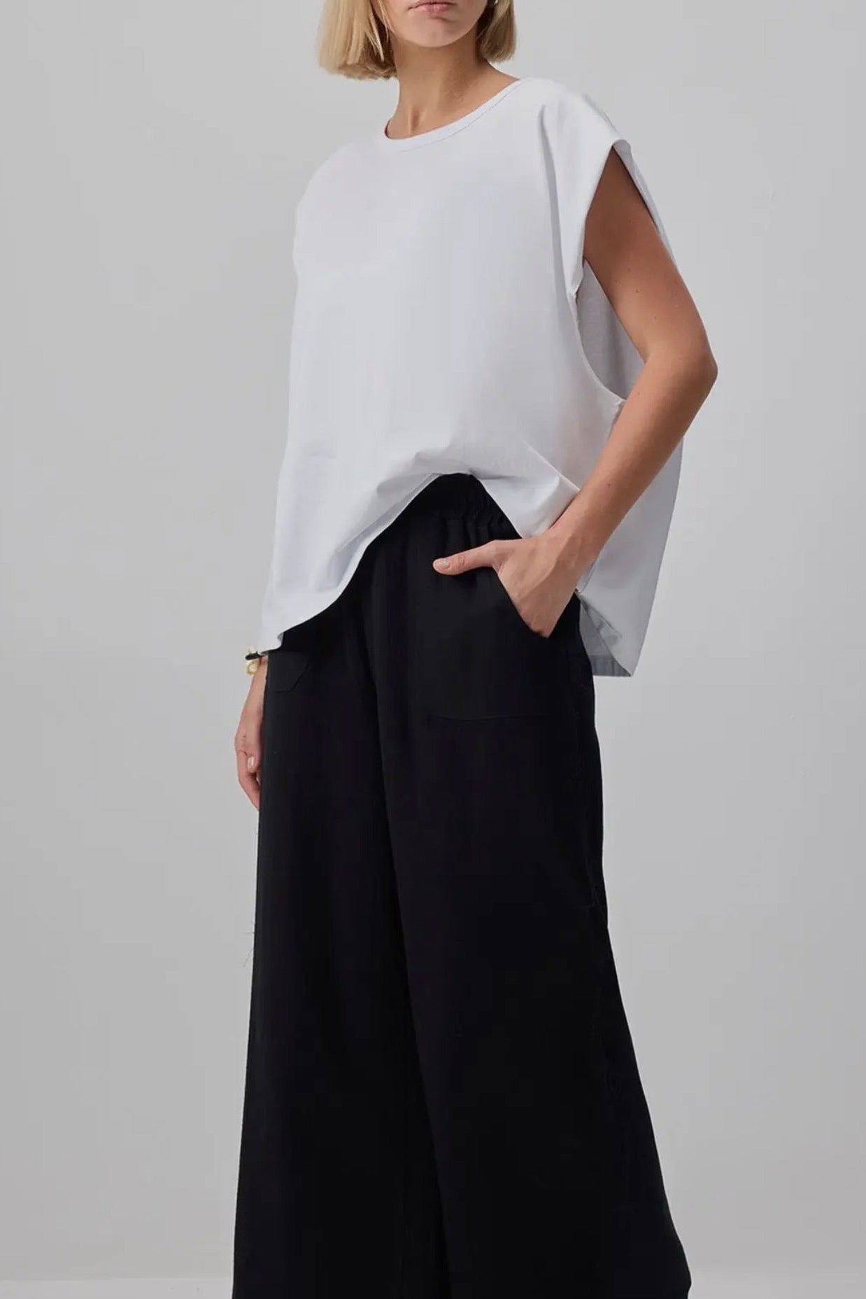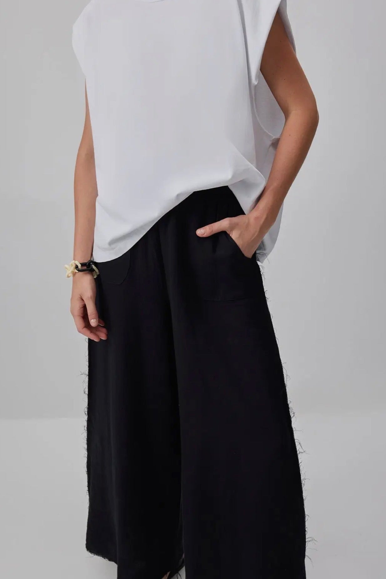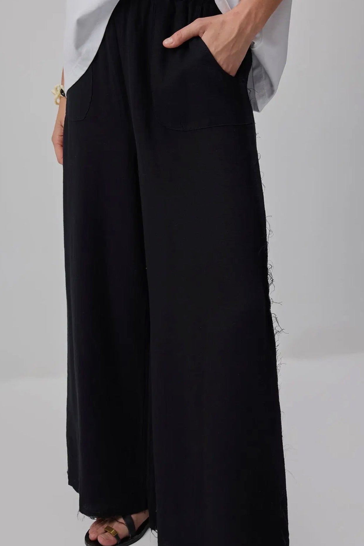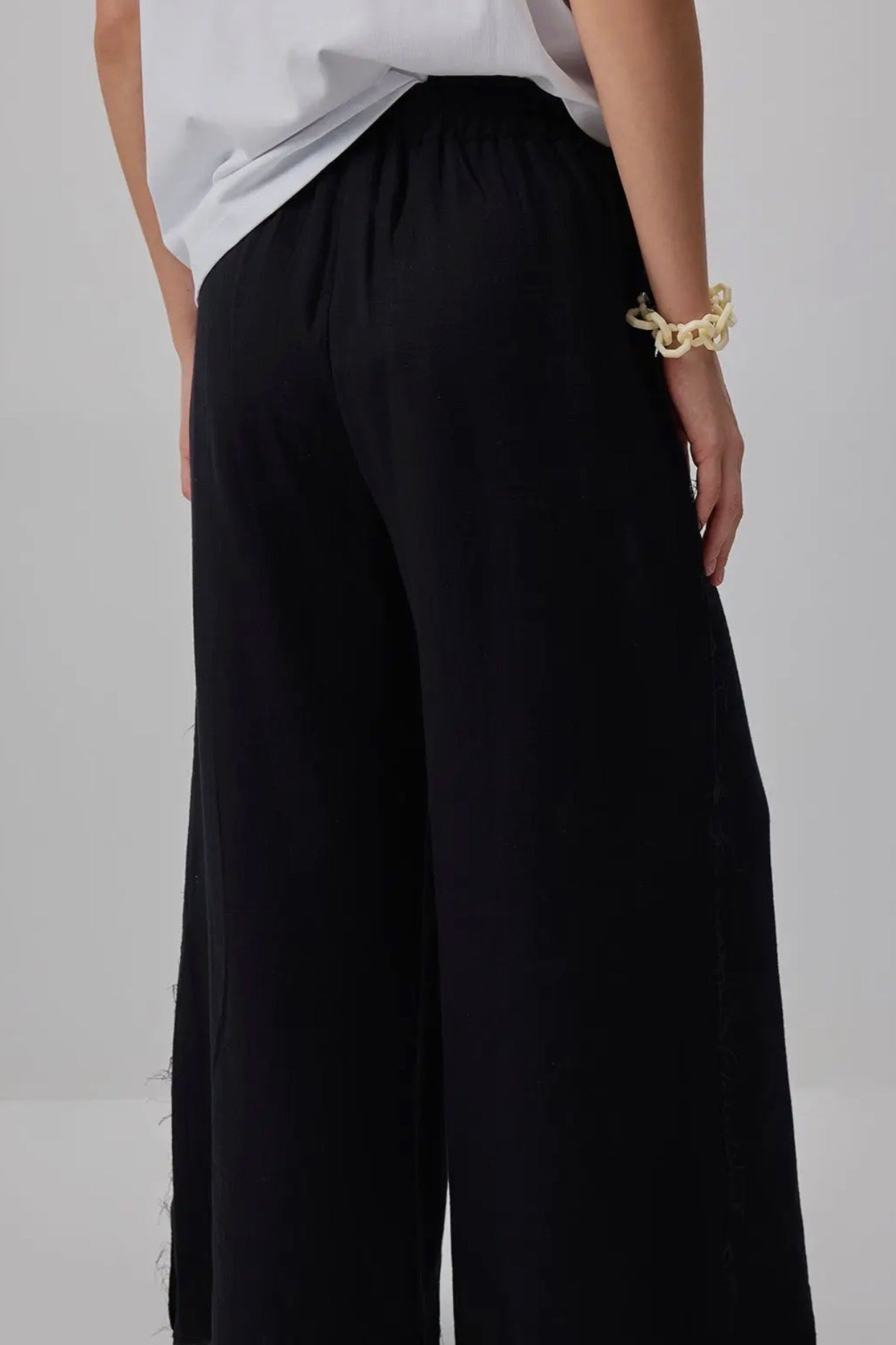 Pantalones de pierna ancha con cintura elástica y bordes deshilachados que aportan un toque moderno a una silueta minimalista. Ligeros y cómodos, ideales para looks relajados o de fin de semana.