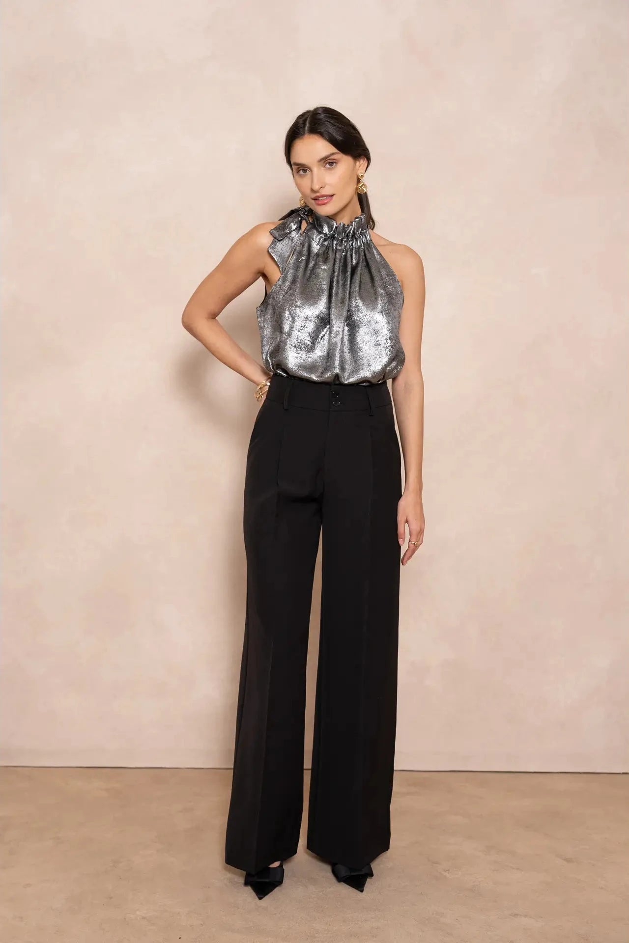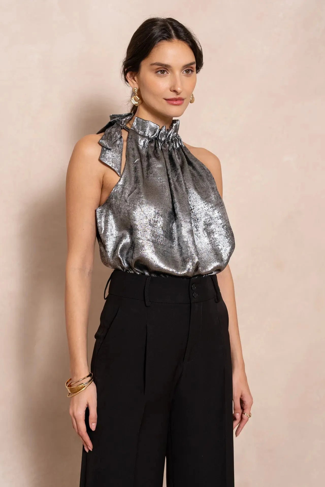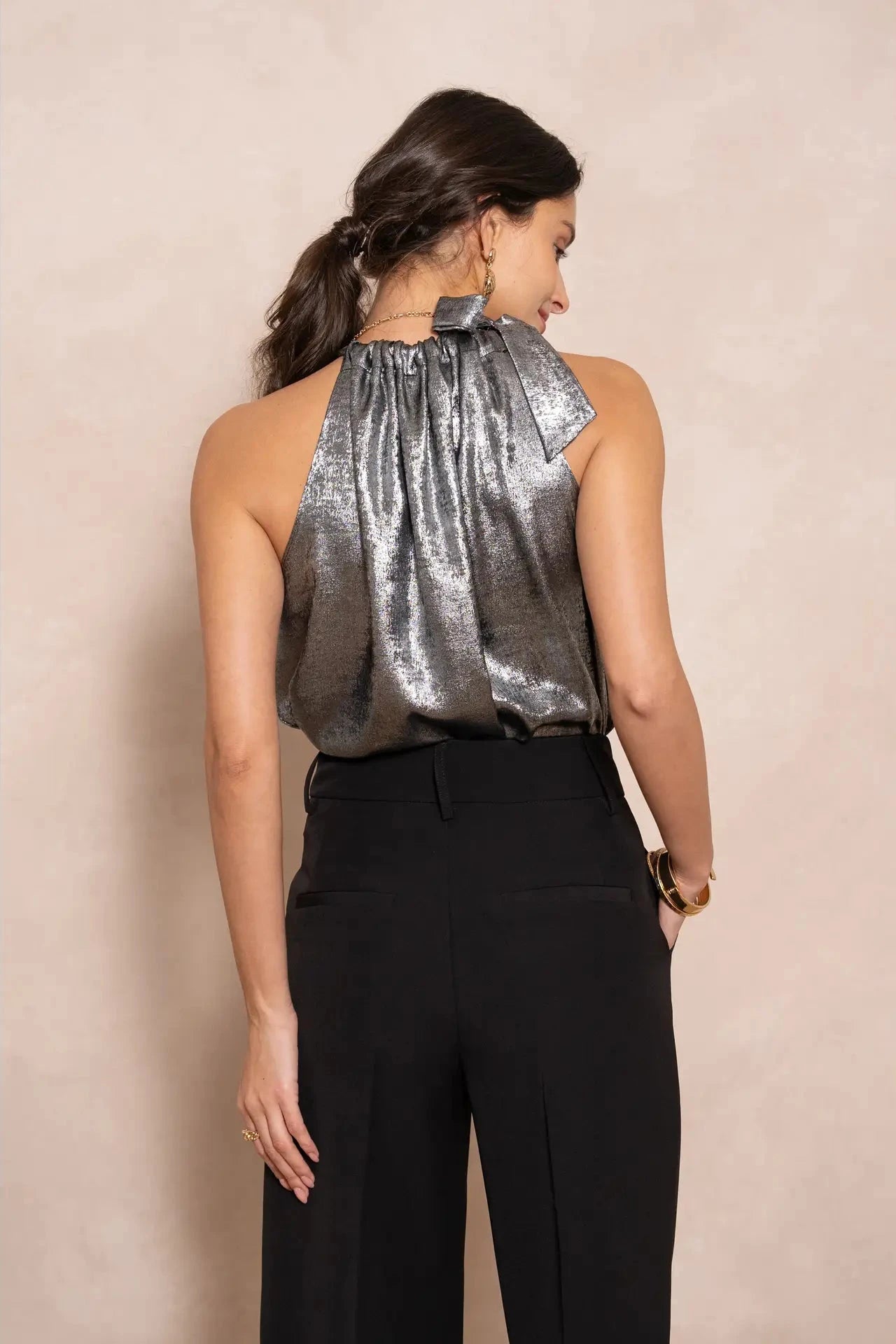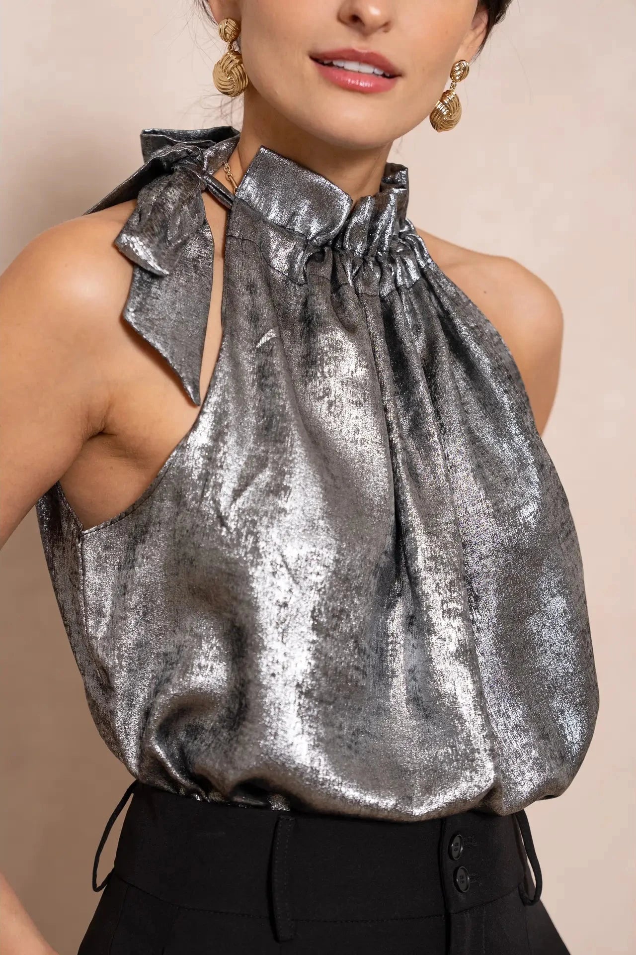 Descubre el top Elisabeth en su versión metalizada: sin mangas, con sisas americanas y lazada al cuello, confeccionado en un tejido brillante que aporta un toque sofisticado y luminoso.