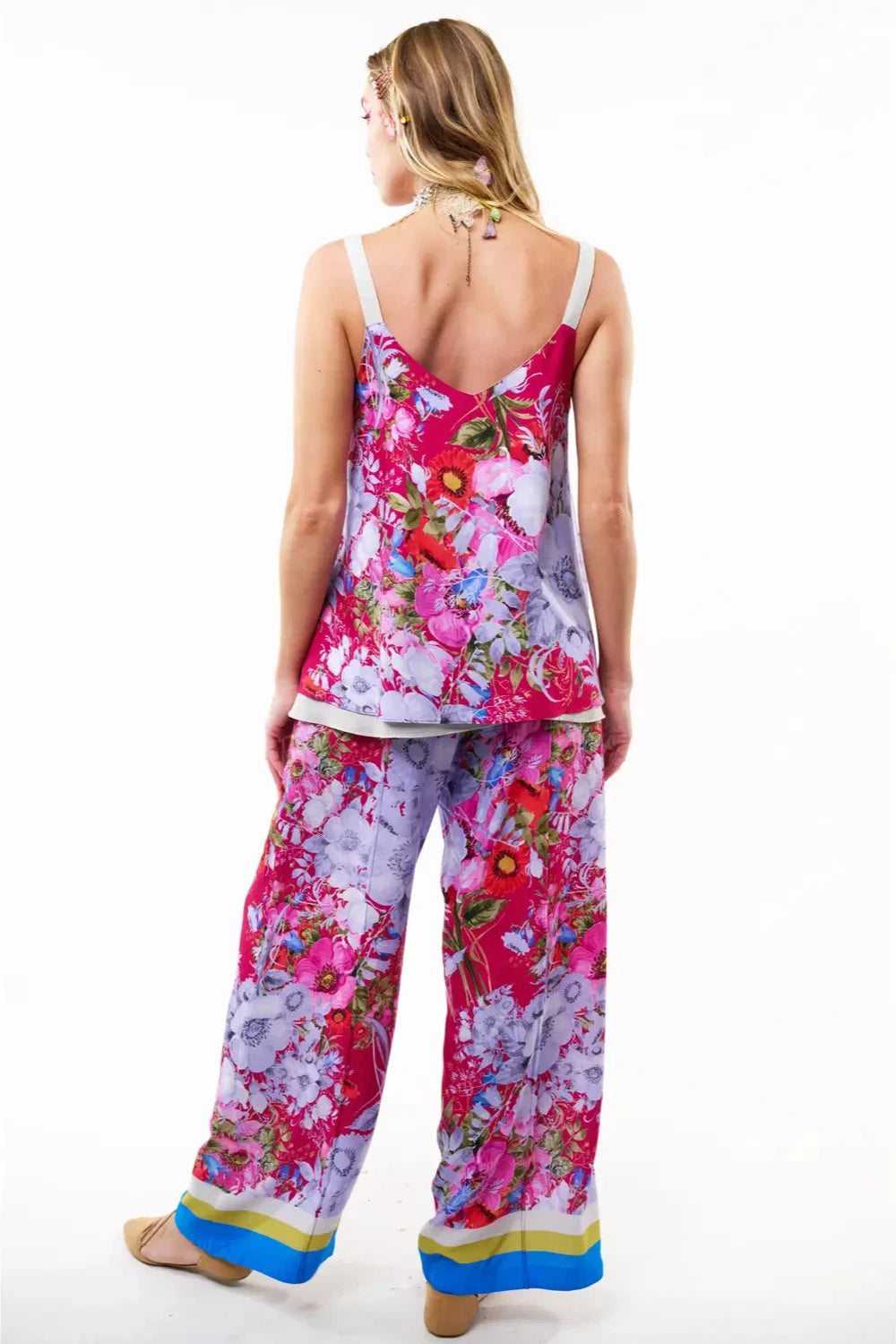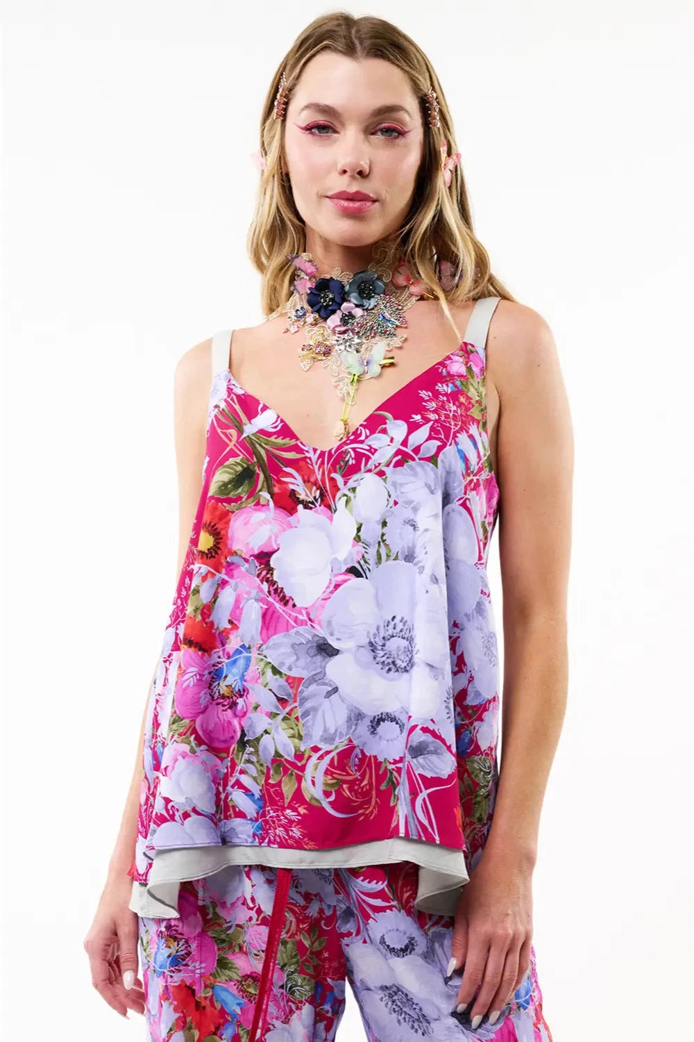 Prenda liviana de tirantes con estampado floral y ribete bordado. Una opción reversible que combina frescura y detalle.