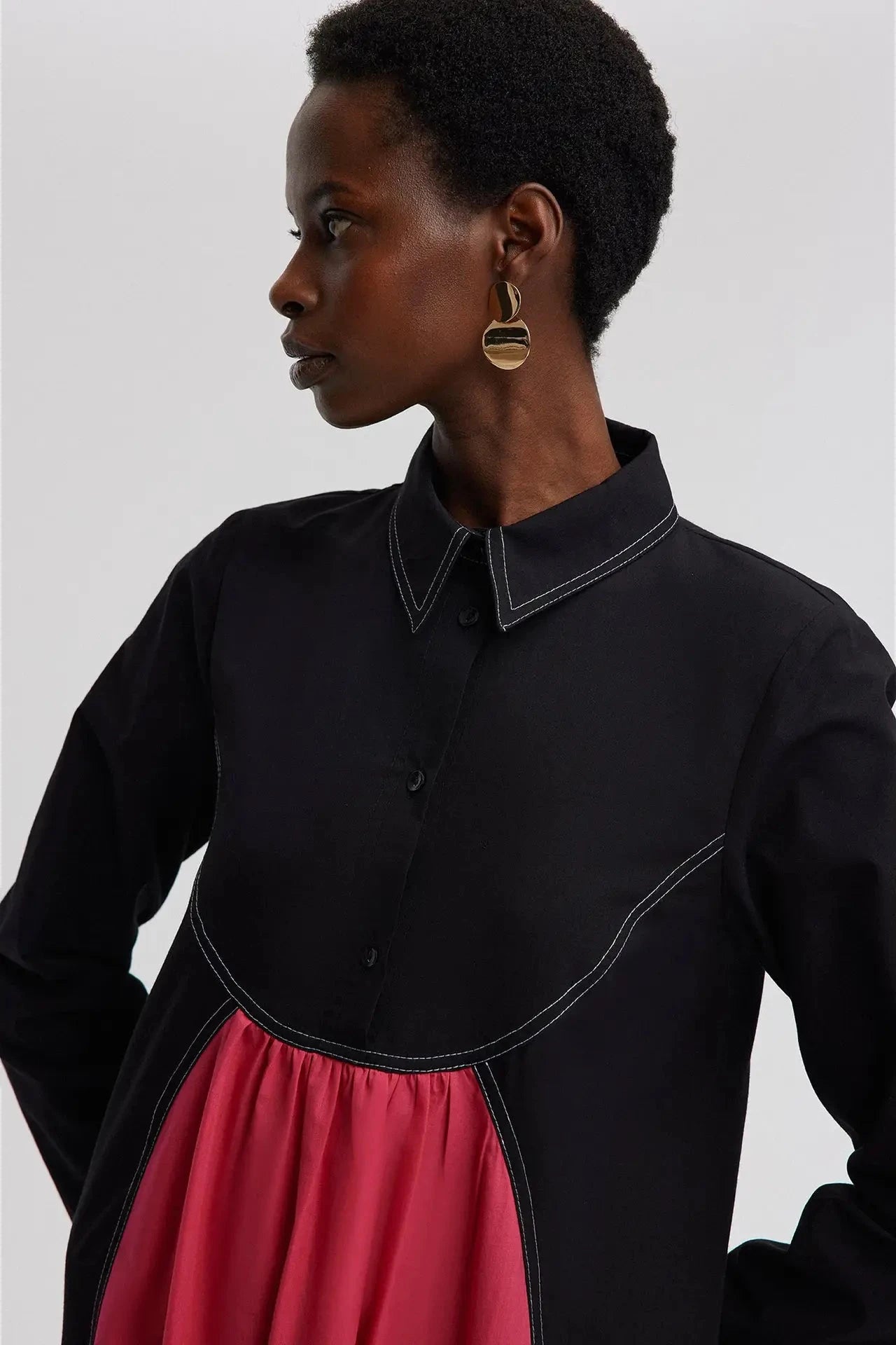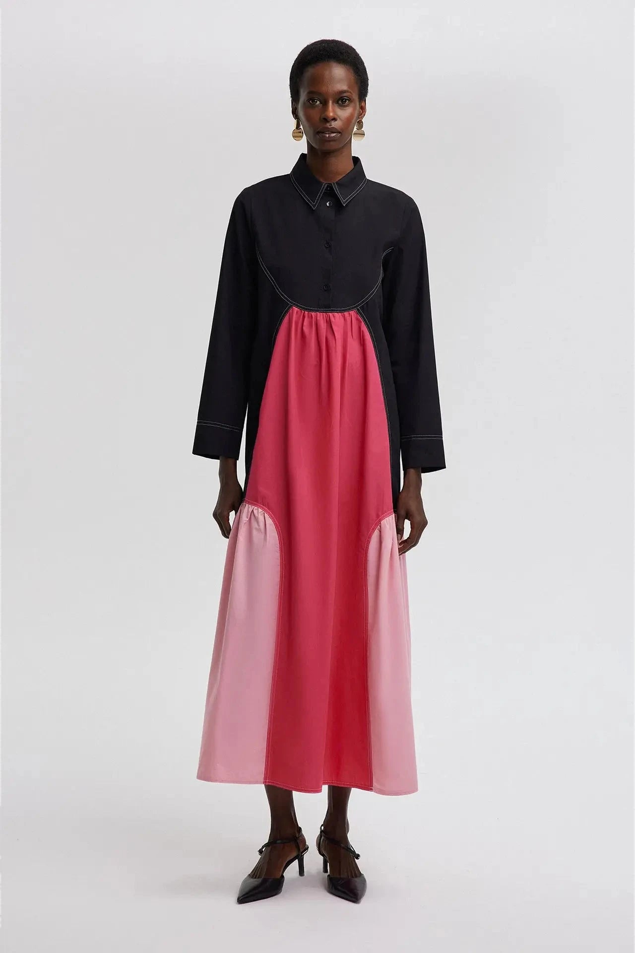 Vestido maxi de bloques de color con cuerpo estilo camisa en negro y paneles fluidos en rosa y fucsia. Silueta moderna y relajada con cuello de solapa y mangas largas, que combina estructura y movimiento para un look super chic.